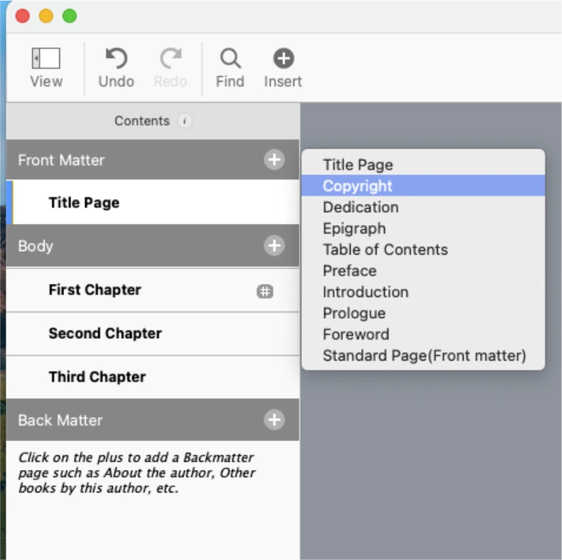 Front Matter 우측의 플러스 버튼을 누르고 Copyright를 클릭합니다.