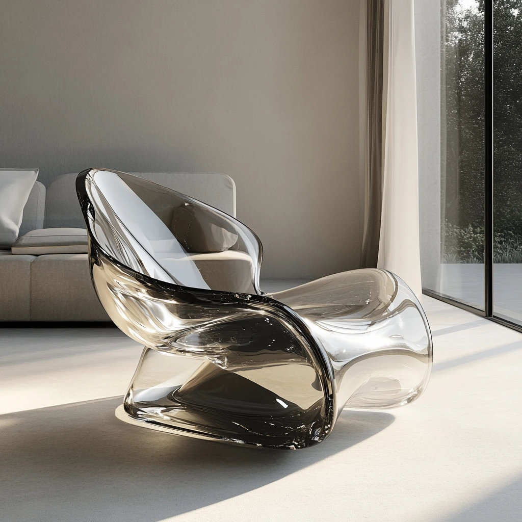투명 유리와 스테인리스로 만들어진 유기적인 형태의 미래 지향적 의자.