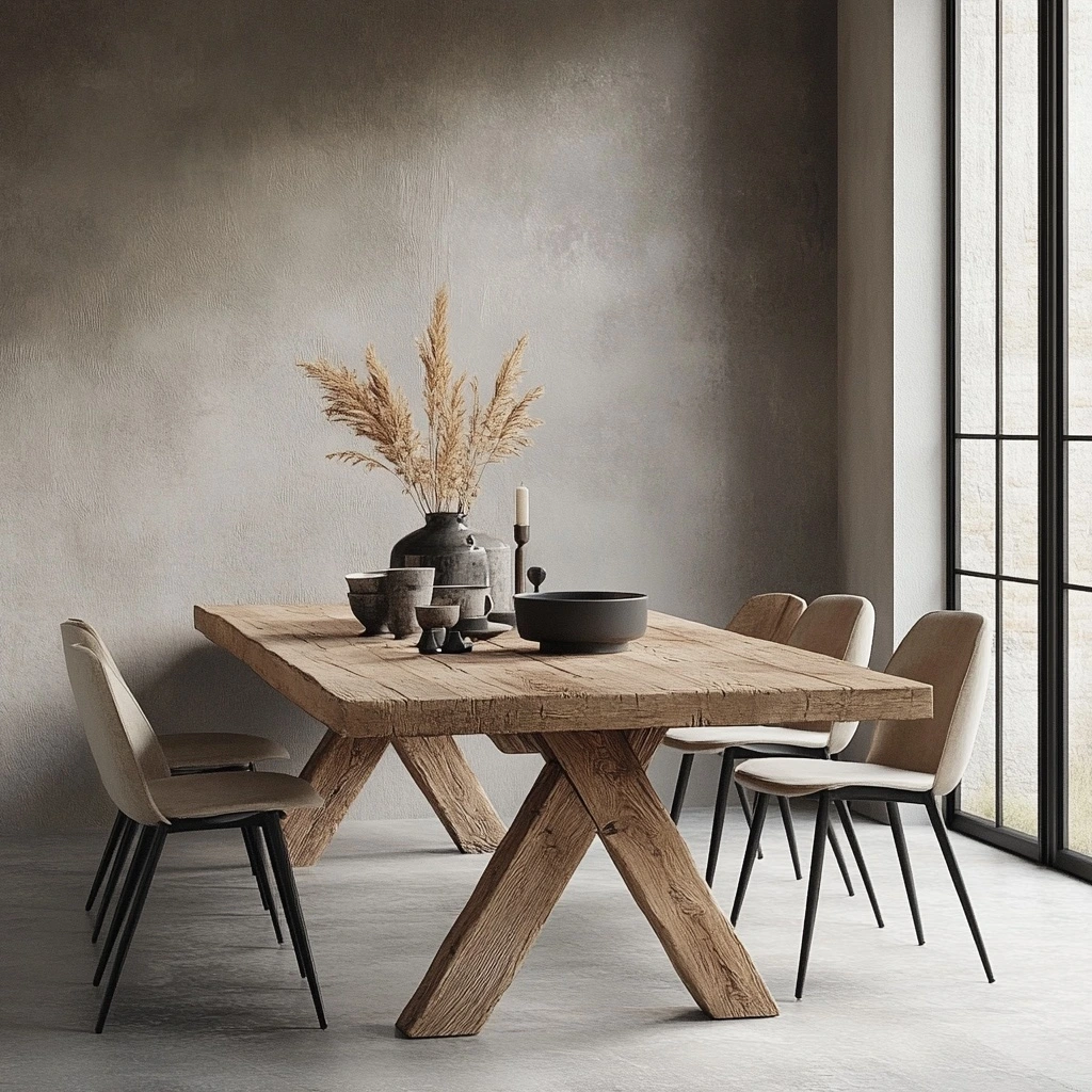 비대칭 다리가 돋보이는 스칸디나비아 스타일의 러스틱한 원목 식탁.