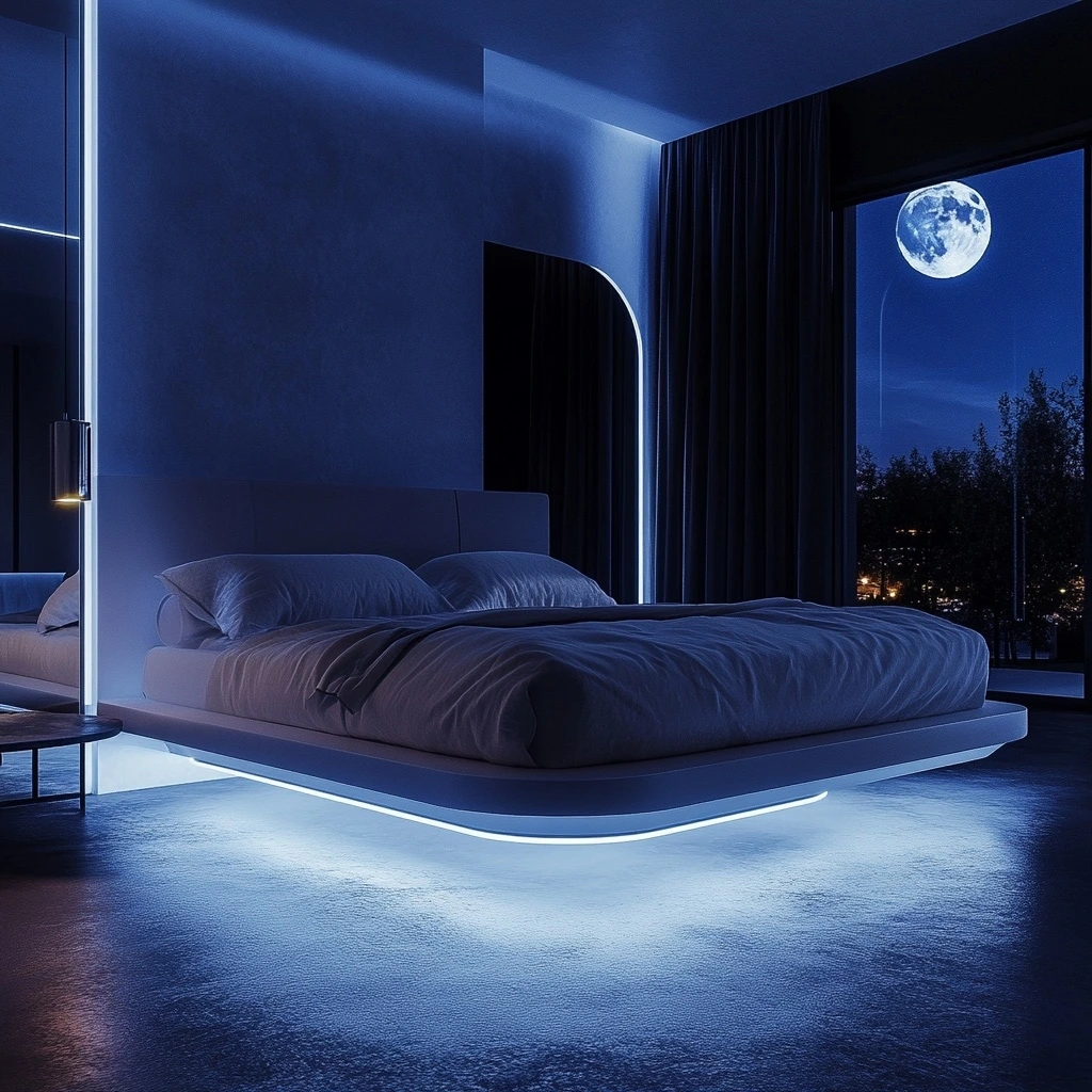 LED 조명이 장착된 플로팅 침대, 달빛이 비추는 방의 미래지향적 디자인.