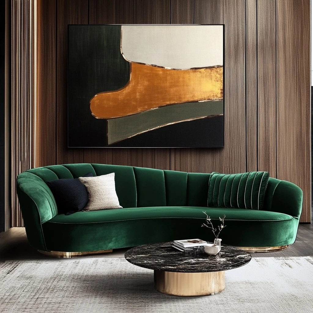곡선형 에메랄드 그린 벨벳 소파, 모던 아트 갤러리에 어울리는 고급스러움.
