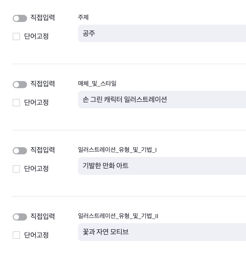 한글 메뉴만 선택하면, 다양한 디자인에 적합한 미드저니 영문 프롬프트를 쉽게 만들 수 있습니다.