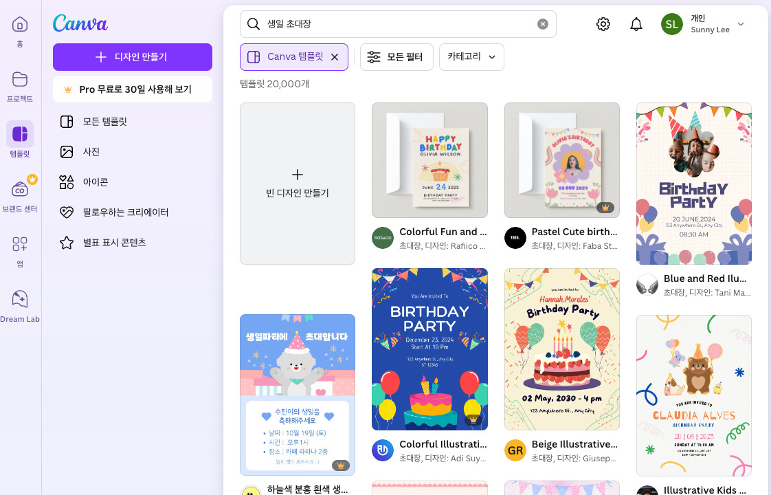 캔바에 들어가서 생일 초대장 템플릿을 검색합니다. 미드저니로 만든 이미지만 넣으면, 바로 사용할 수 있는 초대장을 만들기 위해서입니다.
