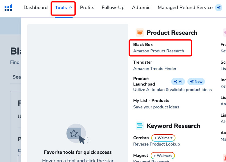 Helium 10에 가입한 후에 Toos 메뉴에서 Black Box를 선택합니다.