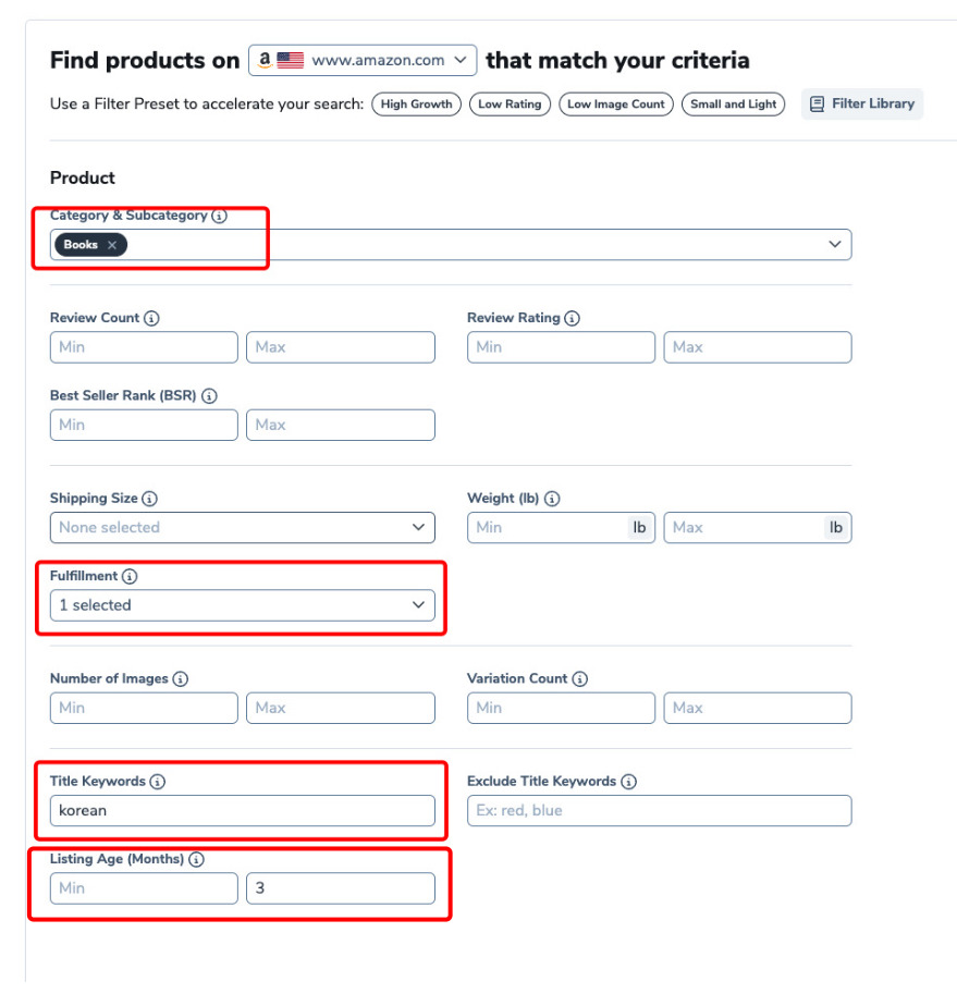 - Listing Age를 최대 3으로 선택합니다. 이것은 출판된지 최대 3개월이 된 책을 찾겠다는 것입니다. 가장 최근에 나온 책 중에 잘 팔리는 책을 찾기 위해서입니다.