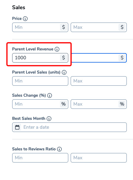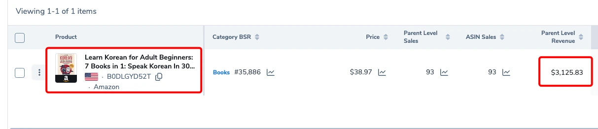 - 오른쪽 메뉴에서는 Revenue (매출)을 최소 1,000 달러로 잡아줍니다. 한달에 최소 1천달러의 매출은 내고 있는 책을 보려는 것입니다