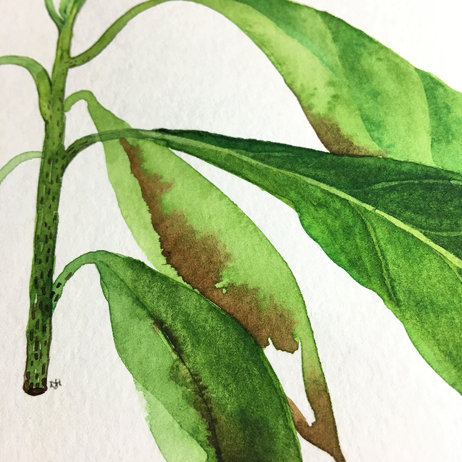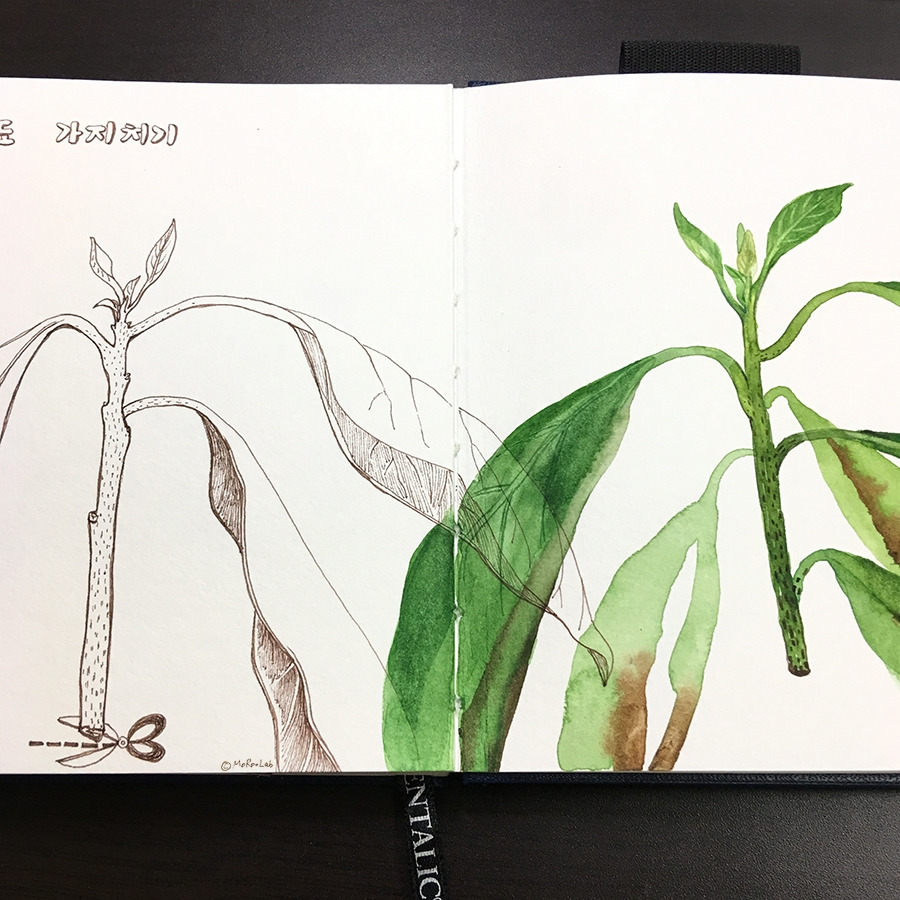 한 면은 펜으로, 옆 면은 수채화의 번짐을 나타내면서 갈변된 잎을 그렸다.