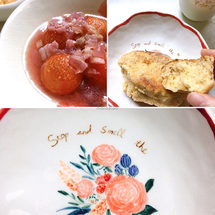 직접 그린 꽃그림 접시에 얼마 전에 만든 스콘을 담아요.