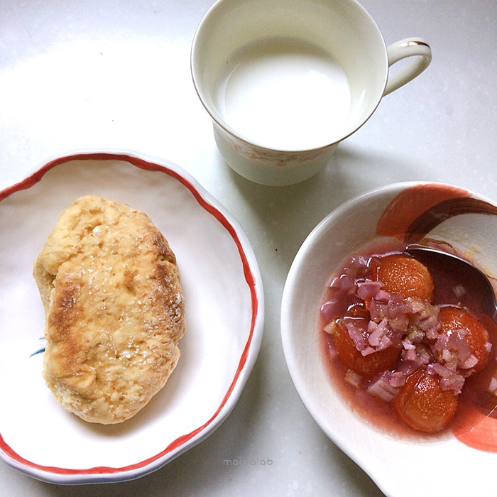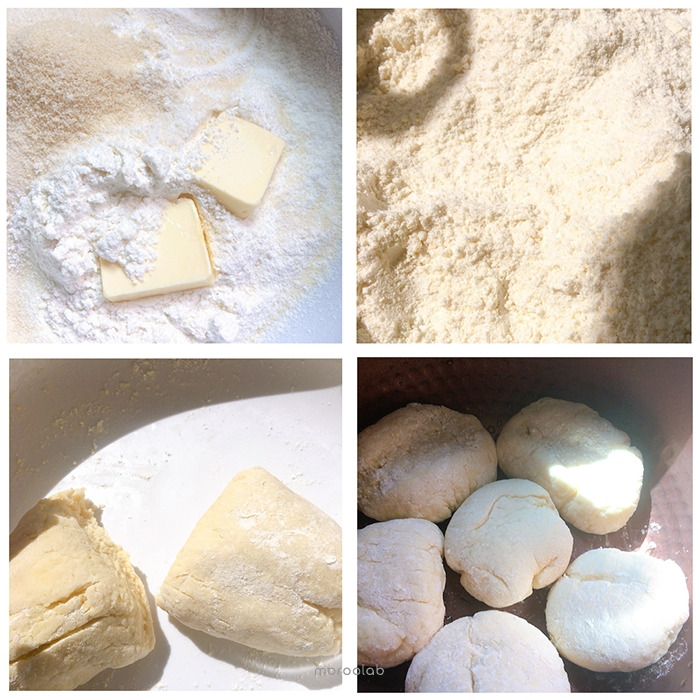 흰 밀가루가 버터와 섞이며 노랗게 보슬보슬, 우유를 넣고 토닥토닥 스콘 모양을 잡아주고 적당히 떼어서 구워내면.
