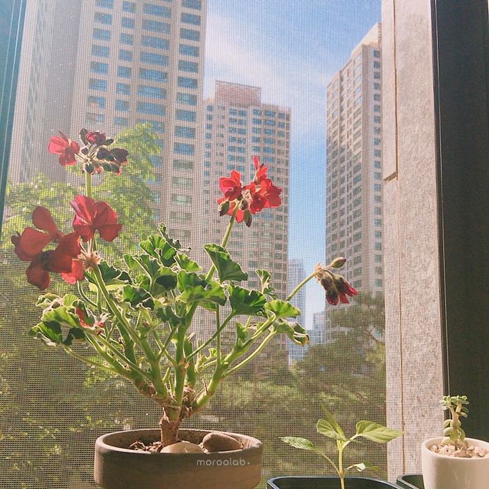 새로 들인 제라늄은 여름의 붉은빛을 보여주고 시들고 또 펼칩니다.