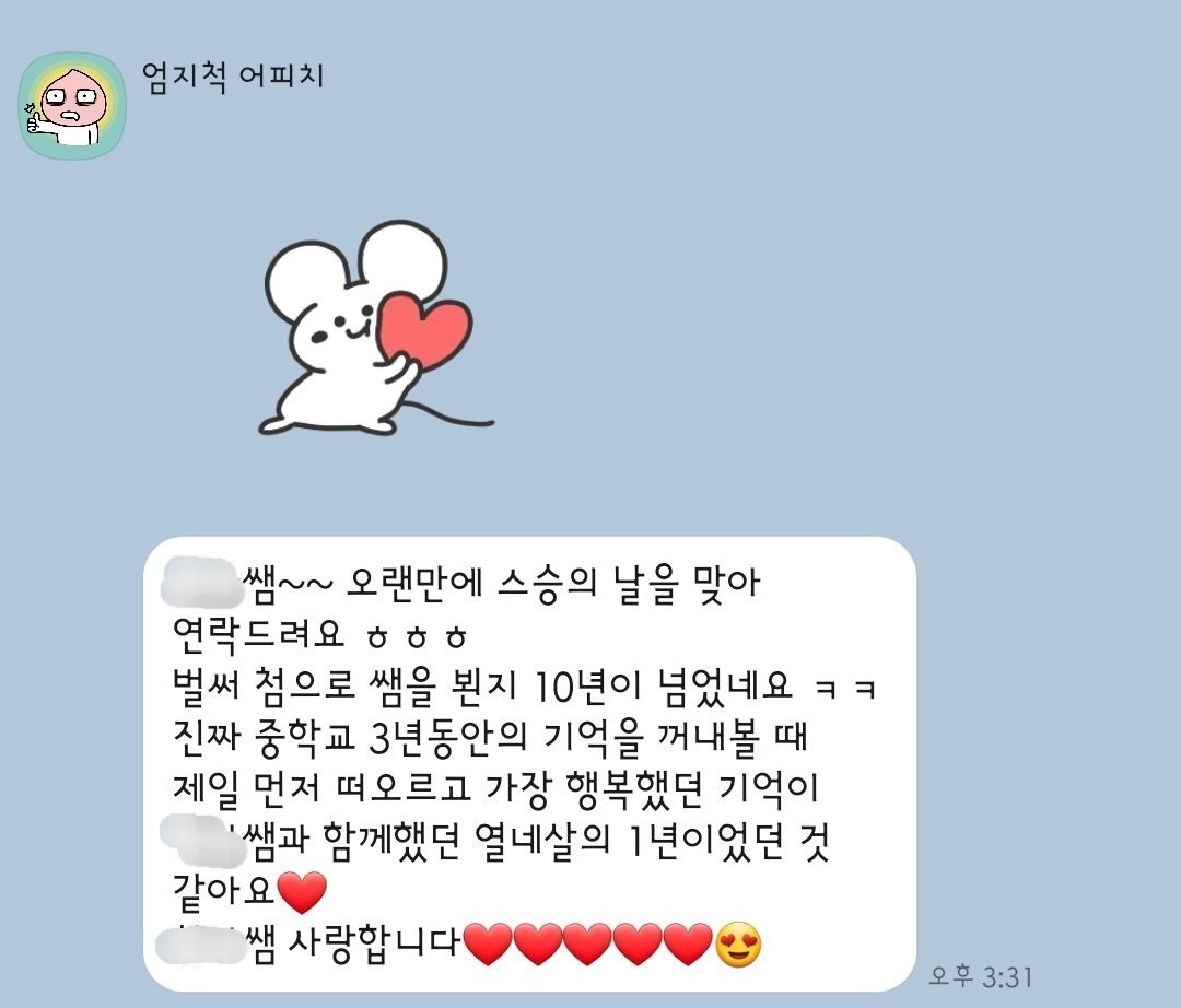 우스운 건, 연락해 온 모든 아이들이 내가 지우고자 했던 그 학교 출신이다. 가장 열정적이었던 때이기도 했고 누군가와 크게 싸울 수 있는 용기도 있을 때였다. 그때의 열정과 진심은 아이들에게도 가 닿았나 보다. 뭘 해도 욕먹고 안 해도 욕먹을 시절에 아이들과 부대끼며 행복했던 순간은 모두에게 잘 간직되어있다. 그러고 보니 학교를 옮길 때마다 비타오백 한 박스씩 사들고 와 연하의 남친으로 오해받았던 제자(10살 차이남ㅋㅋ)도 그 학교에서 만났다.