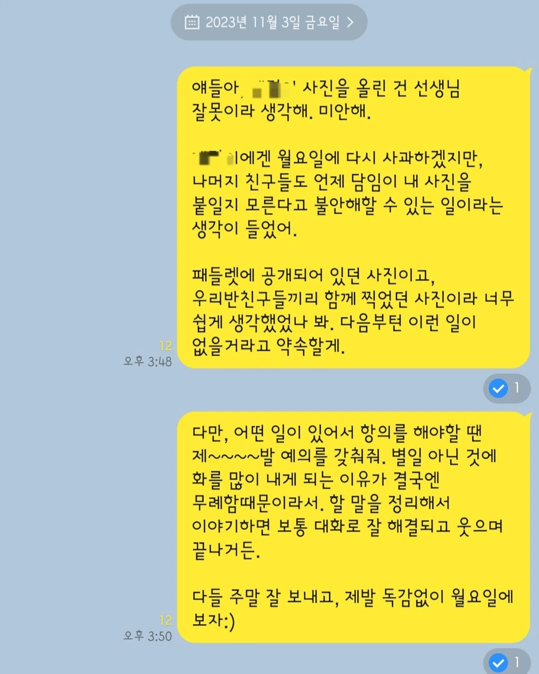 먼저 아이에게 개인톡을 보내 정말 미안하다 전했다. 설왕설래의 과정을 지켜본 우리 반 아이들에게도 (월요일 조회시간에 이야기하겠지만) 단톡방에 미리 사과를 했다. 보호자께도 자초지종을 설명하고 잘 다독여달라, 죄송하고 감사하다 전했다.