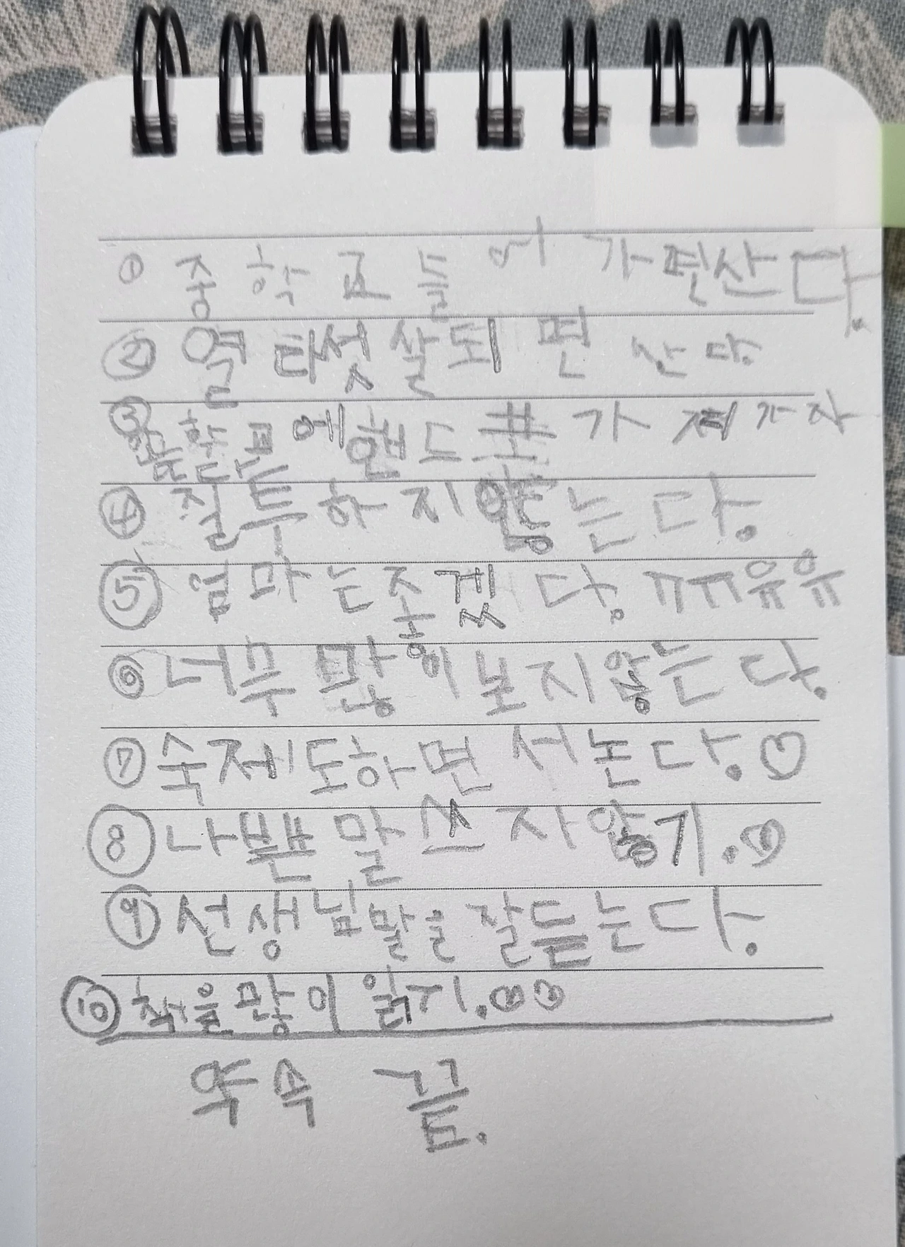 우리딸이 스스로 생각한 휴대폰을 사기 위한 약속이다. 혼자 뭘 이렇게 많이, 그리고 열심히 적는 걸 이때 처음 봤다ㅎㅎ