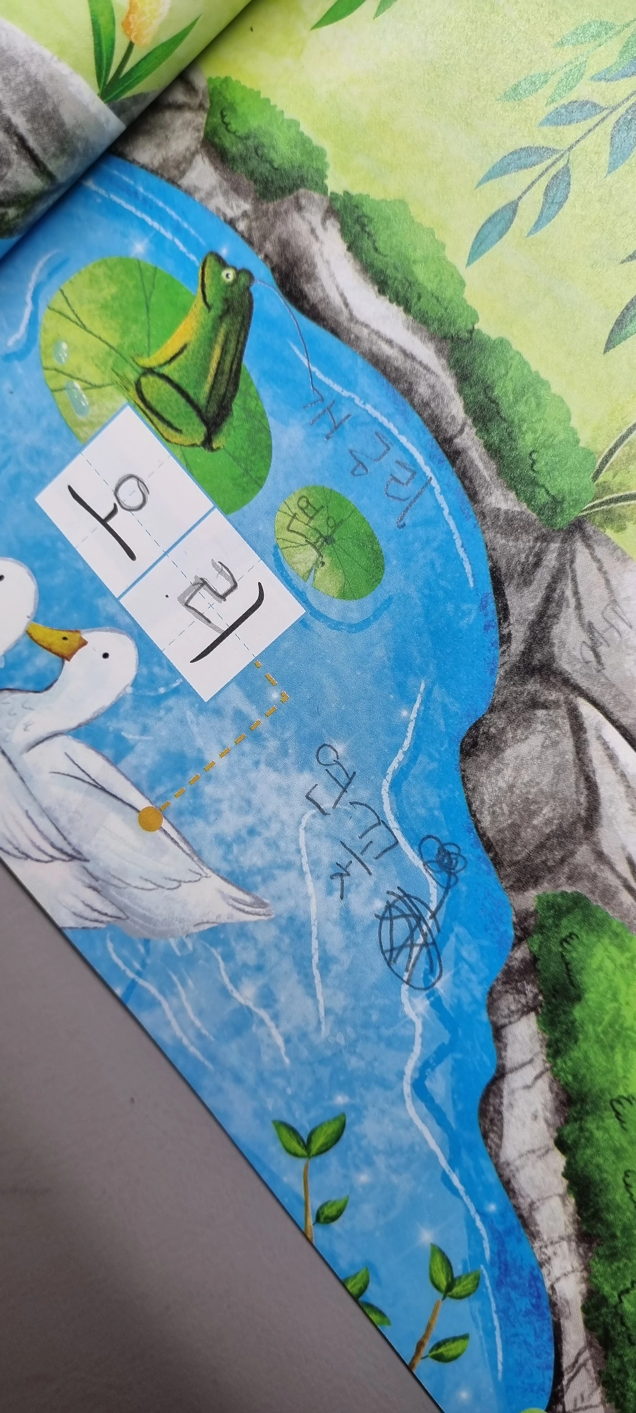 연잎을 쓰고 연꽃을 그려넣은 마음이 예쁘다. "왜 낙서했어?!" 대신 "연잎이 혼자 있어 외로워 보였구나?"라고 말해줬다.