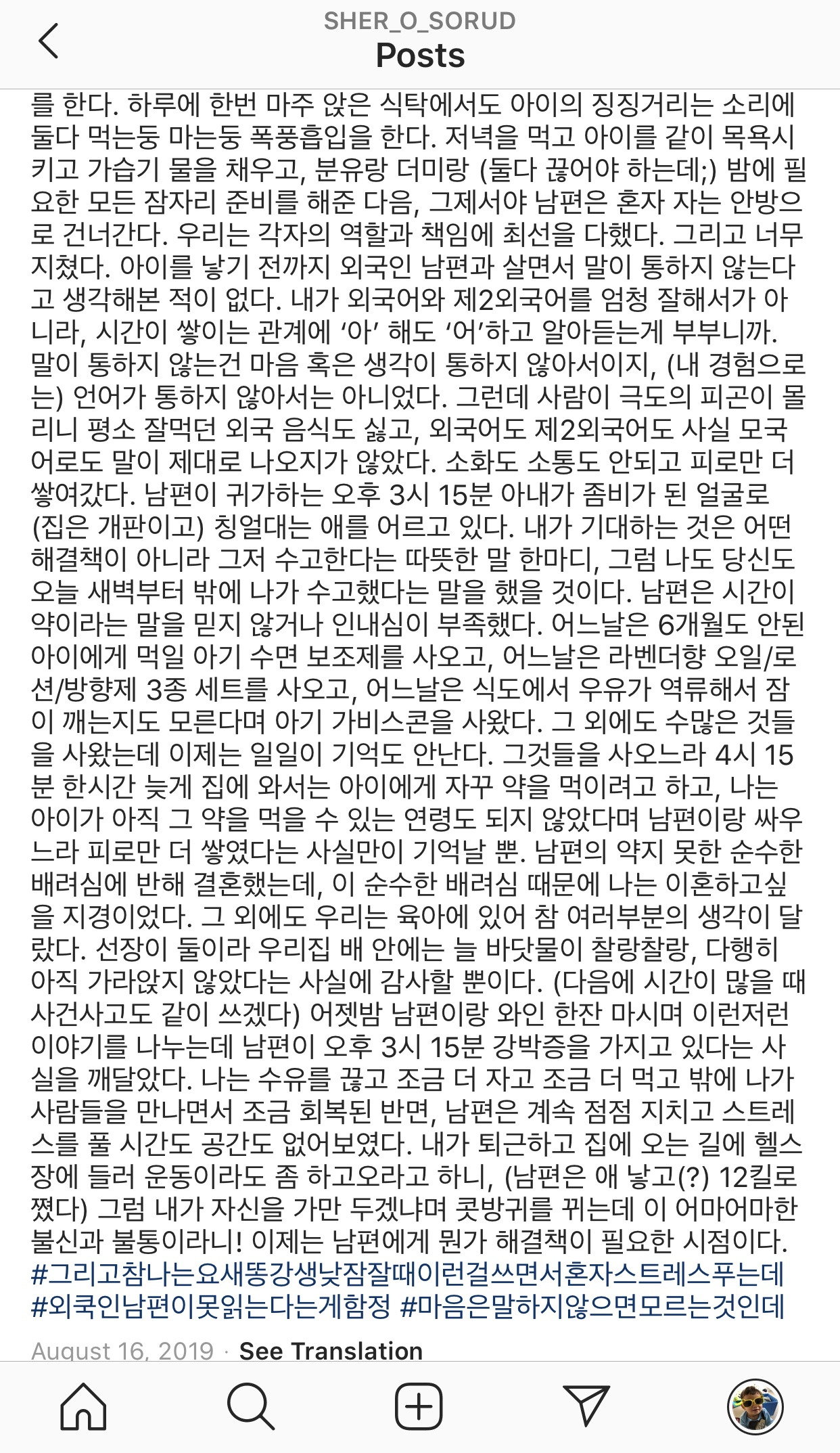 내 인스타를 보고 내가 정말 즐겁게 육아를 하고 있다고 생각하는 친구들이 더러 있었다. 단언컨대 육아가 그렇게 신나고 재미난 일이었다면 나는 결코 인스타를 하지 않을 것이다. 하루 종일 아이와 전쟁을 치르고도 내가 아직 죽지 않았다는 외마디 비명이요. 해외에서 아직 말 못 하는 아이와 속시원히 말이 안 통하는 외국인 남편과 같이 살면서, 여기에라도 말하지 못하면 죽을 것 같아서 나의 모국어로 한글을 읽을 수 있는 한국인들에게 알리는 신문고이다. 가끔 하고 싶은 말이 너무 많아 인스타에 쓸 수 있는 최대치 글자 수를 다 채워 쓰기도 하여 사람들을 놀라게 하기도 한다.
