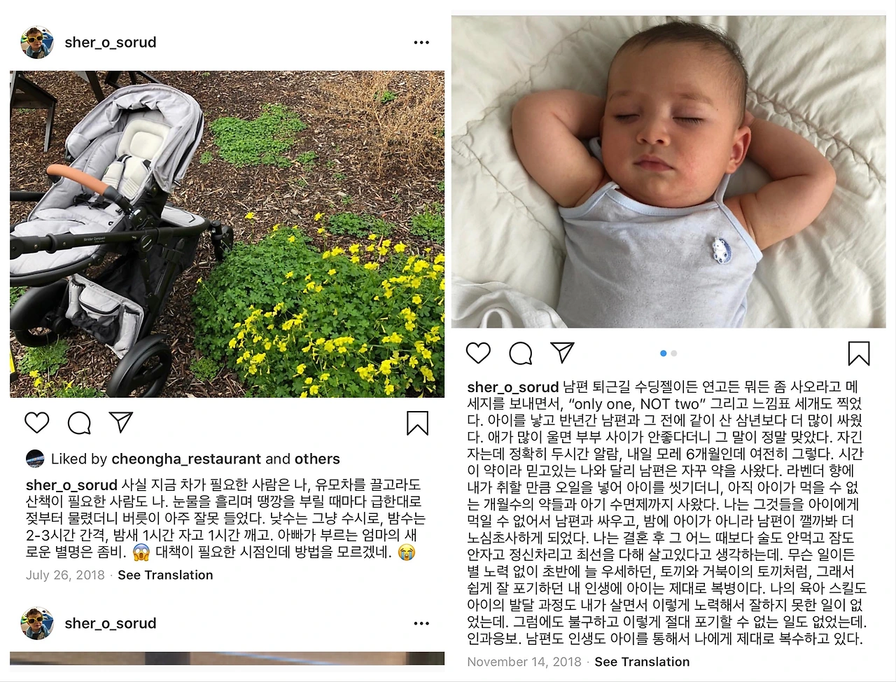 아직 말을 하지 못하는 아이와 하루 종일 씨름하는 엄마의 하소연을 매일 쓰며 스트레스를 푼다. 아이가 하루 종일 이유 없이 징징거릴 때, 저도 어디가 아프거나 불편하니 저러겠거니 싶다가도, 엄마에게도 말할 수 없는 울분과 답답함이 치밀어 오른다. 그것을 매일 남편에게 말로 다 풀자니 가뜩이나 서로 힘든데 자꾸 싸움만 되고, 그렇다고 술로 풀자니 아이 때문에 밤잠까지 못 자는 형편에 피로만 가중되었다. 그래서 인스타에 글로 다 풀었다. 모두에게 속 시원히 말했지만 아무도 들어주지 않아도 상관없는 오픈 일기장인 셈이었다.