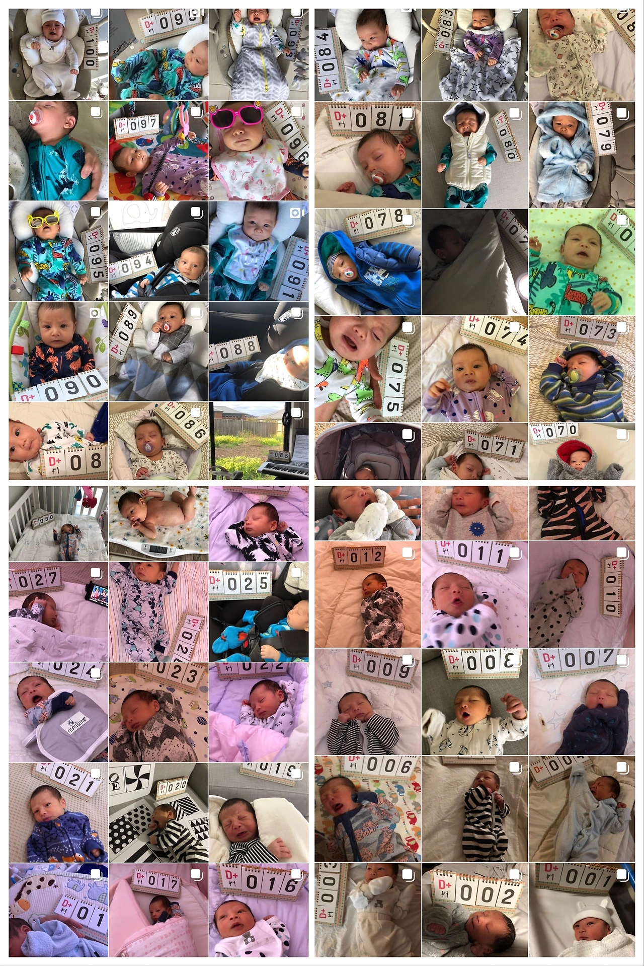 백일까지는 매일 디데이(D-Day) 달력을 배경으로 세워두고 하루도 빠지지 않고 사진을 찍어 올렸다. 목도 가누지 못하는 아이에게 매일 새로운 옷을 입히겠다고 엄마 혼자 애 아닌 애를 썼다. 그리고 그날그날의 사건사고를 적었다. 병원에서 퇴원한 날, 배꼽에서 탯줄이 떨어진 날, 출생 신고를 한 날, 처음으로 엄마 아빠와 바깥 산책을 한 날, 마트에 장을 보러 간 날, 쪽쪽이를 처음 물린 날, 김정은이 트럼프와 첫 회담을 한 날(!), 응급실에 간 날, 아이가 울 때 눈에서 처음으로 눈물이 나오던 날, 성당에서 세례를 받은 날 등의 사건을 그날의 사진과 함께 모두 기록하였다.