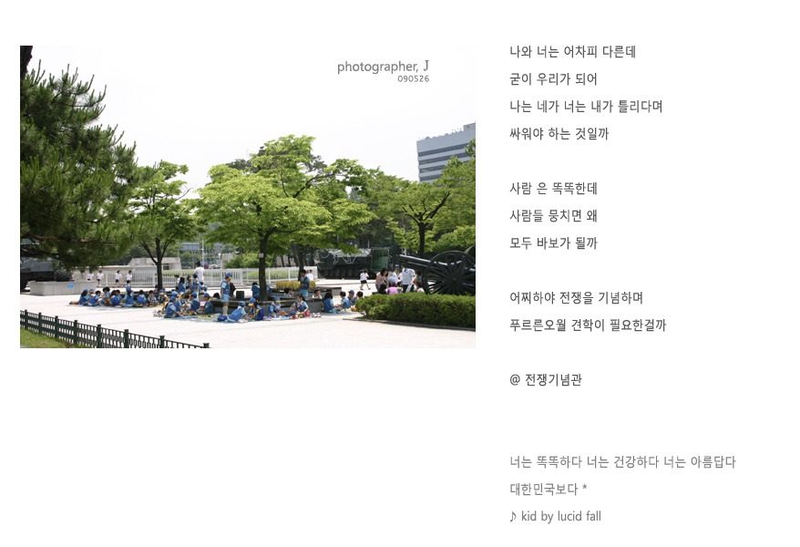그러나 나는 머리가 굵어지면서 ‘우리’라는 이름으로 정당한 것처럼 행해지는 세상의 폭력들이 참 싫었다. 전쟁의 잔인함, 정치의 공권력, 집단 이기주의, 사회 차별주의 등 인간들이 서로 편을 묶고 가르고 하면서 인지상정 혹은 최소한의 인간의 도리마저 저버리는 우리네 인간이 참 미웠다. 그런 우리라면 차라리 나와 너로 돌아가는 게 낫겠다 싶었다.