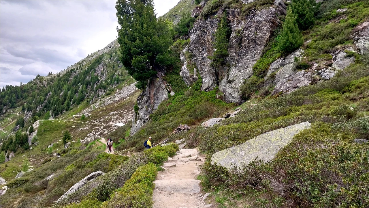 이 길은 그랑발콩노드 Grand balon nod이다. 실제는 몽블랑 남쪽 산허리 발코니 같은 길을 걸으면서 건너편의 브레방 쪽 파노라마 산군을 감상하는 길이다. 2시간 40분가량 걸어서 몽땅베르 역에 도착한다.