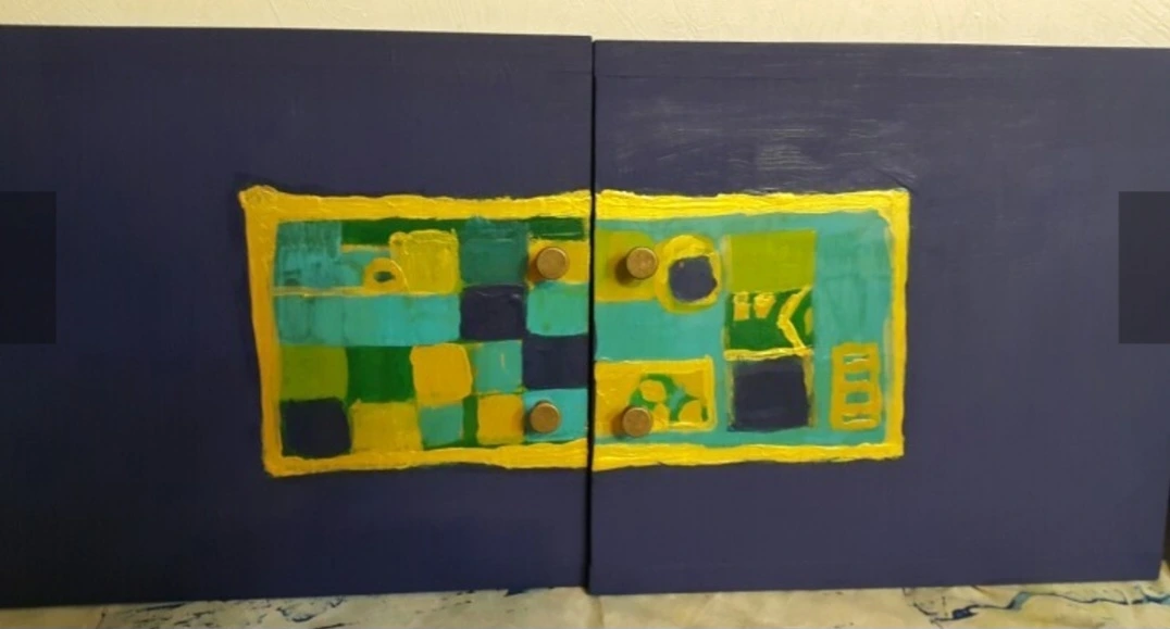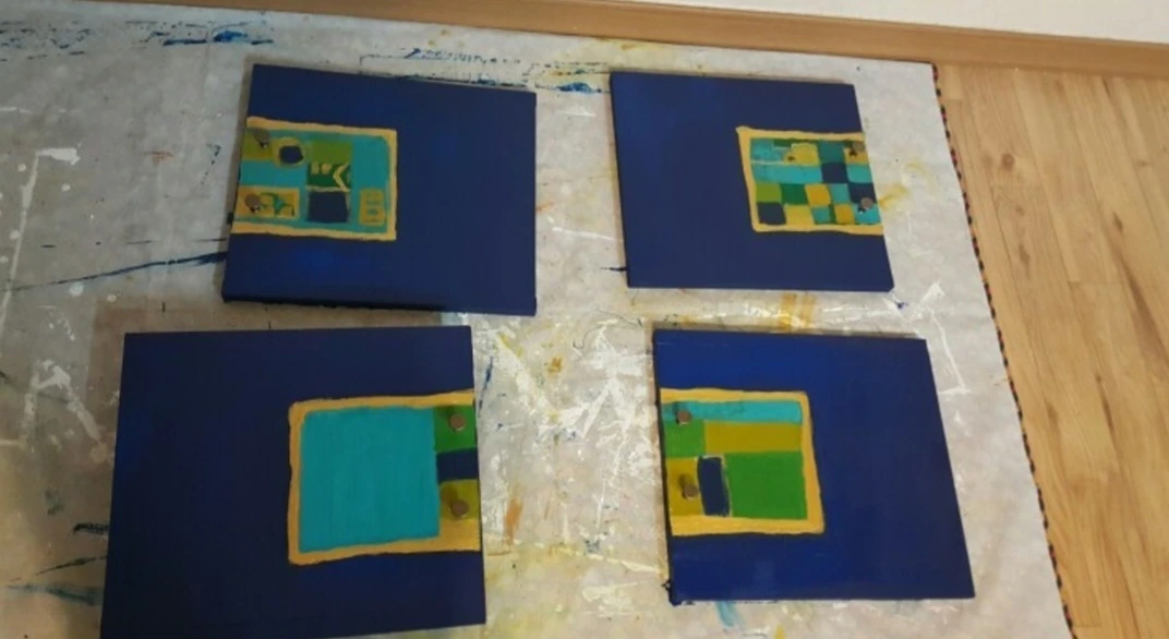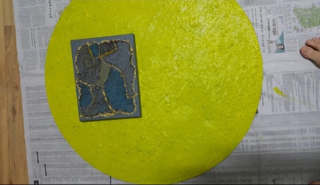 변기만 놓여있는 거실의 작은 화장실이 칙칙한 것 같아 손잡이 xx에서 두께 10mm 지름 700mm짜리 커다랗고 동그란 합판을 주문했다. 유화 보조제인 모델링페이스트로 입체감을 낸 후 수성본드를 입혀 방수막을 입힌다. 즉석으로 그린 소품과 수건걸이 바구니로 마감할 예정.