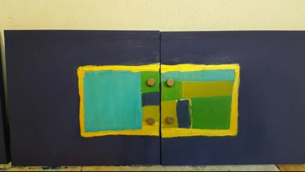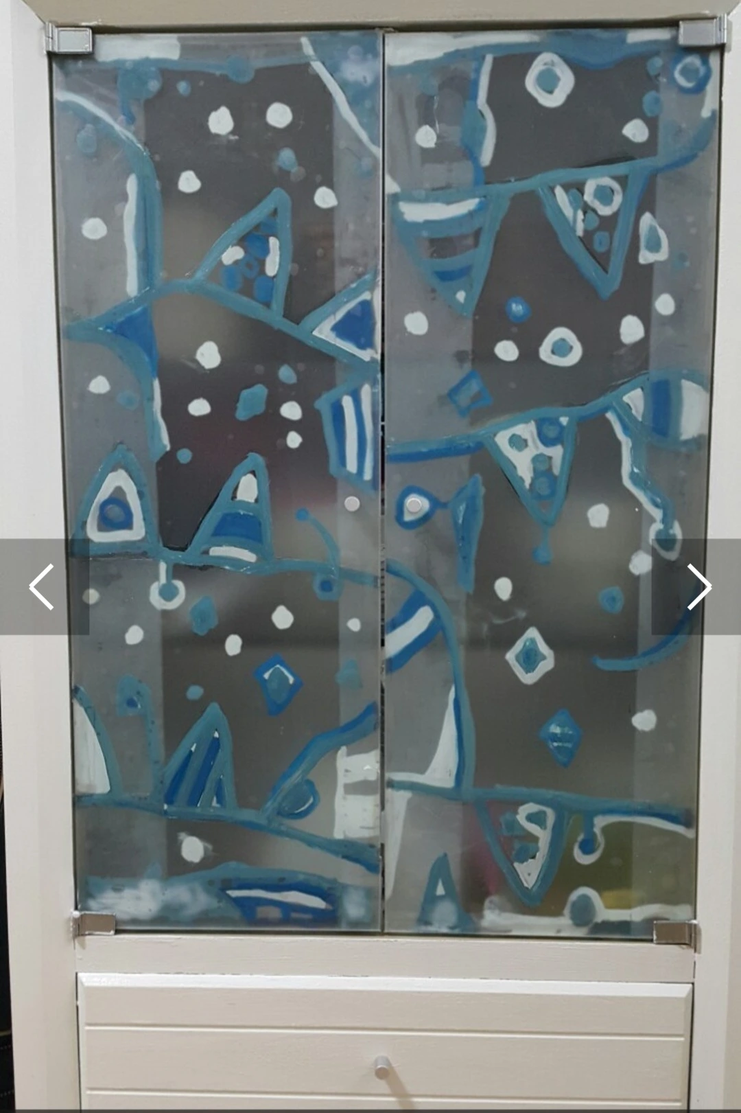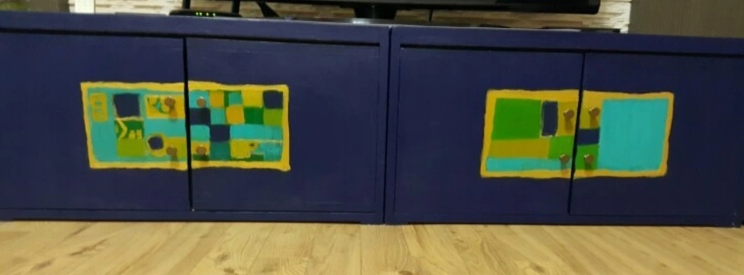 비록 집성목이지만 원목이라고 불리웠던 TV 장에 옷을 입혔다. 젯소 칠하고, 수성페인트로 그림 그린 후 수성바니쉬로 마감한다.