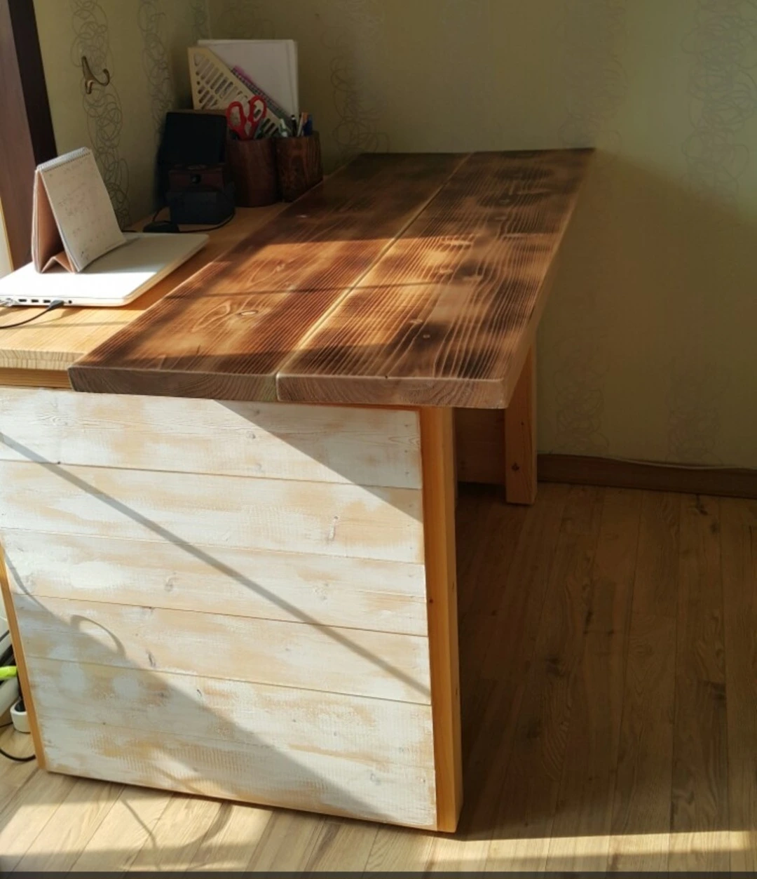 리폼 하이라이트 아일랜드 식탁. 쓰던 원목책상 옆면을 주문한 미송으로 가린다.