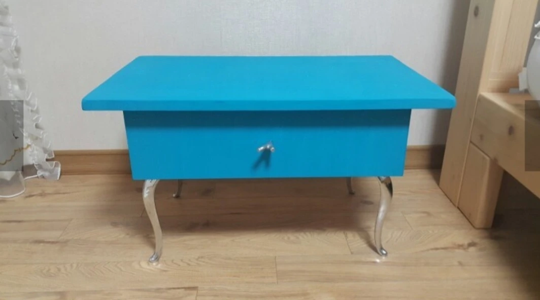 이십 년 이상 사용한 MDF 콘솔이었는데 긴 다리를 짧은 다리로 갈아입히고 곡선으로 치켜들었던 양쪽 면이 부서져 버려 반듯이 잘라내고 비비드 한 컬러를 입혔다. 침대 사이드 장으로 포인트를 줄 예정.