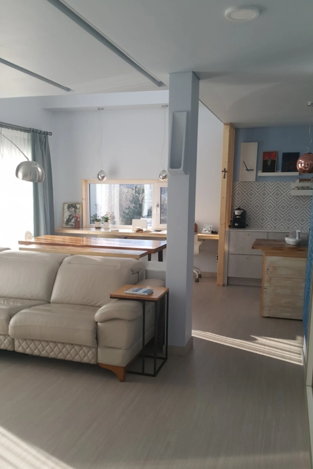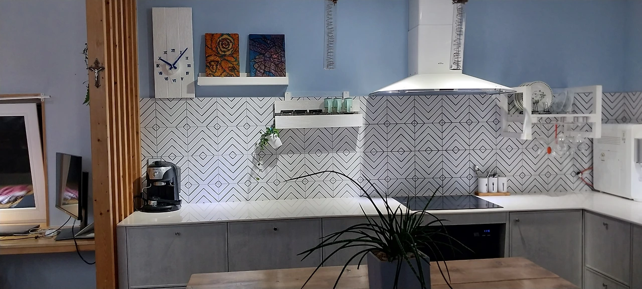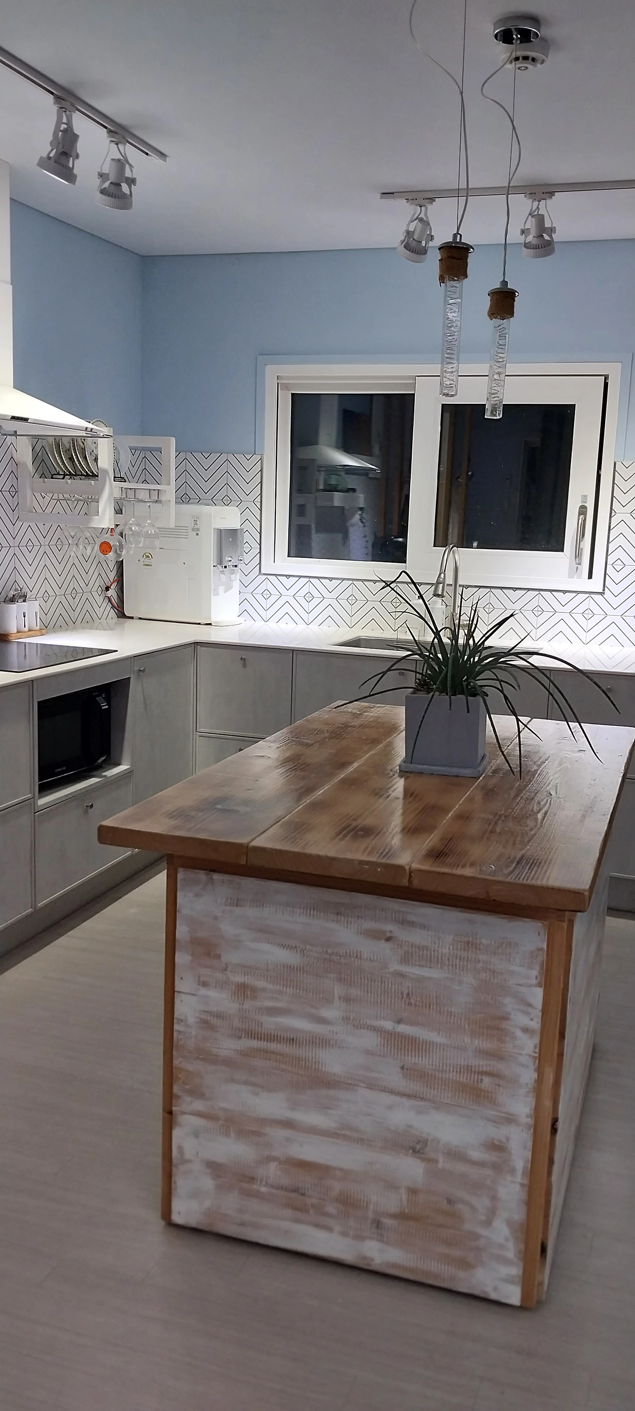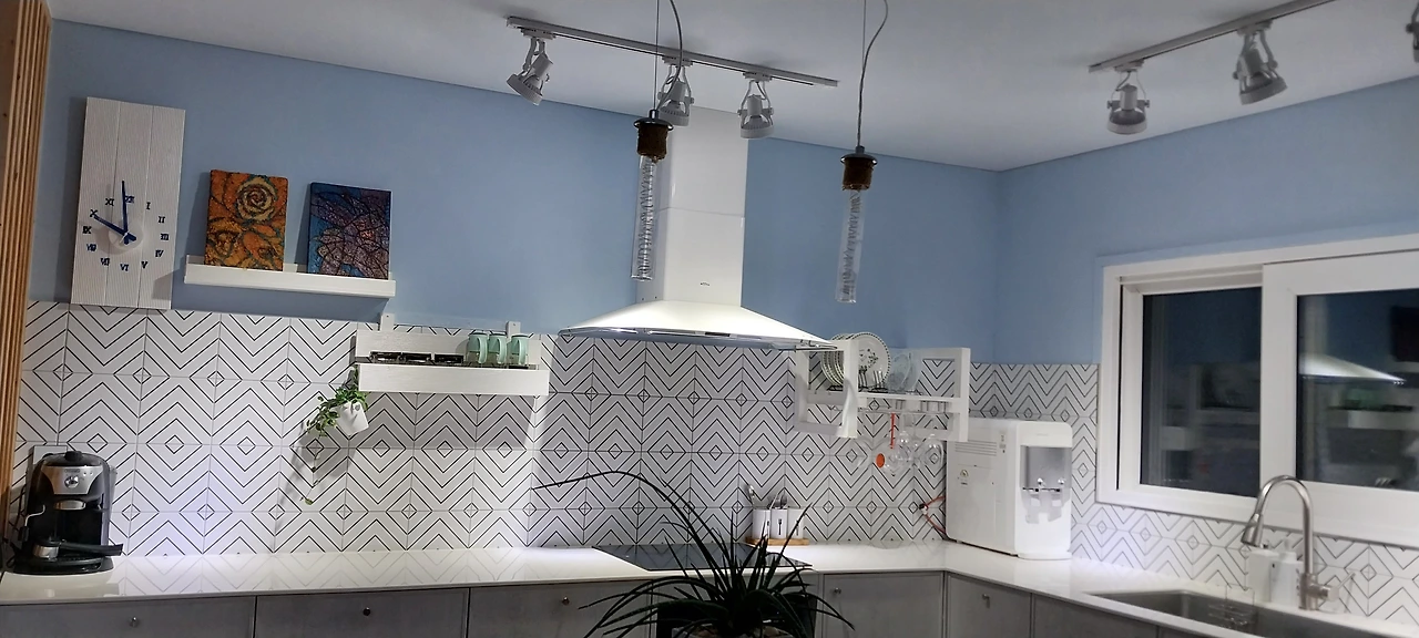 주방의 아일랜드 식탁, 시계, 액자와 받침, 양념장, 접시장 들은 모두 영자작품. 싱크대와 책상의 경계를 나무 파티션으로 했고 식탁도 커다란 원목 식탁이라 아일랜드 식탁이 특별히 이질감이 느껴지는 것 같지는 않다.