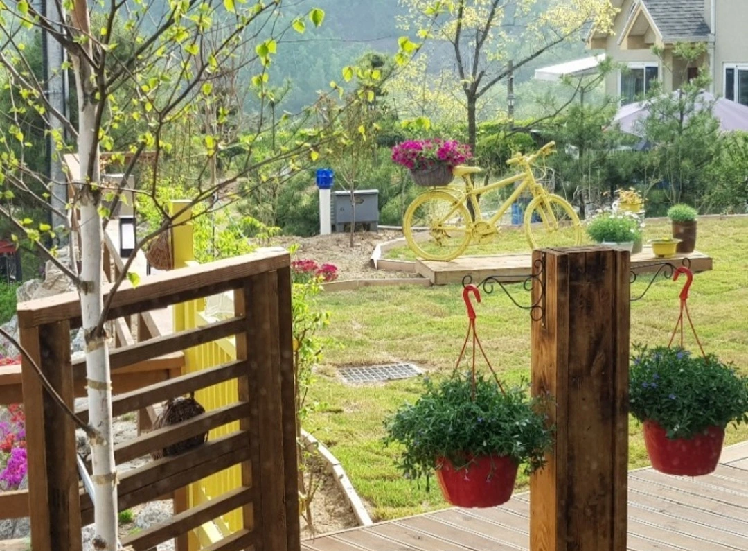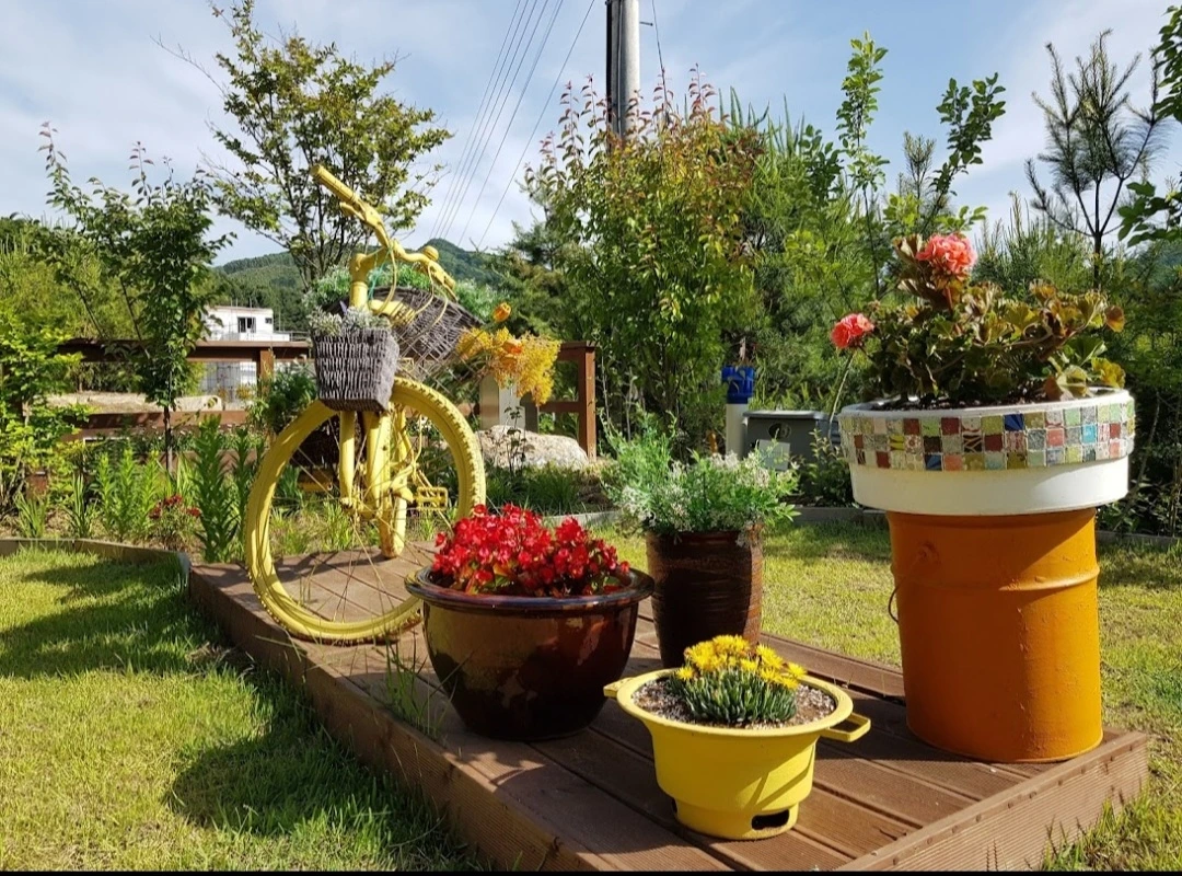 고심 끝에 나무 데크를 만들어 덮었다. 데크 위에 폐자전거, 자전거 위에 꽃장식. 타일 붙인 폐세면대, 망가진 미니화로, 페인트통. 온갖 폐품을 재활용하여 마당을 꾸민다.