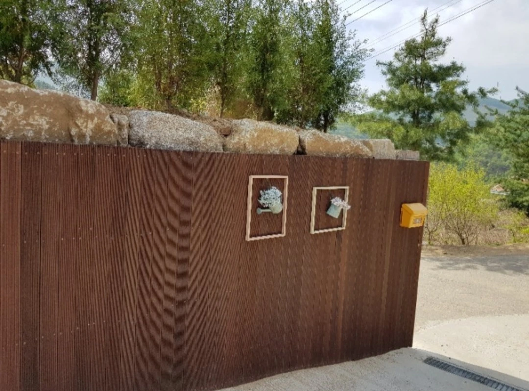 철재 세제통은 주황색 화분이 되어 담장을 장식하고, 반대쪽 나무벽엔 버려질 위기의 스틸액자 프레임을 이용해 꽃화분을 걸었다.