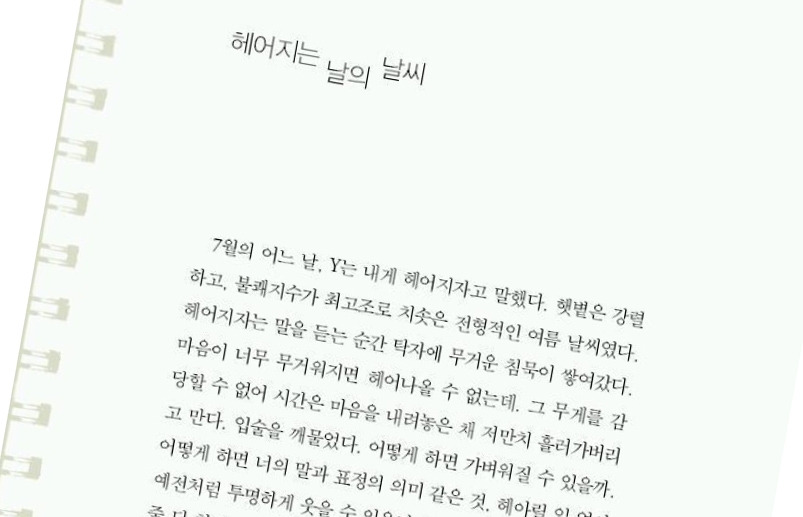 사진과 글이 합쳐져 하나의 결과물이 되듯 둘은 연인이 되었고 소중한 시간들을 함께 했지만 청춘의 열병은 영원하지 못했고 결국은 헤어지게 됐다. 글을 쓰는 사람답게 그녀는 항상 자기의 책을 한 권 내고 싶다고 입버릇처럼 얘기했다. 언제일지는 알 수 없지만 언젠가는 분명 나올 거라 나 또한 생각했다. 그래서였을까, 시간이 꽤 지나 인터넷 서점에서 책 쇼핑을 할 때면 별생각 없이 그녀의 이름을 한 번씩 검색하곤 했다.