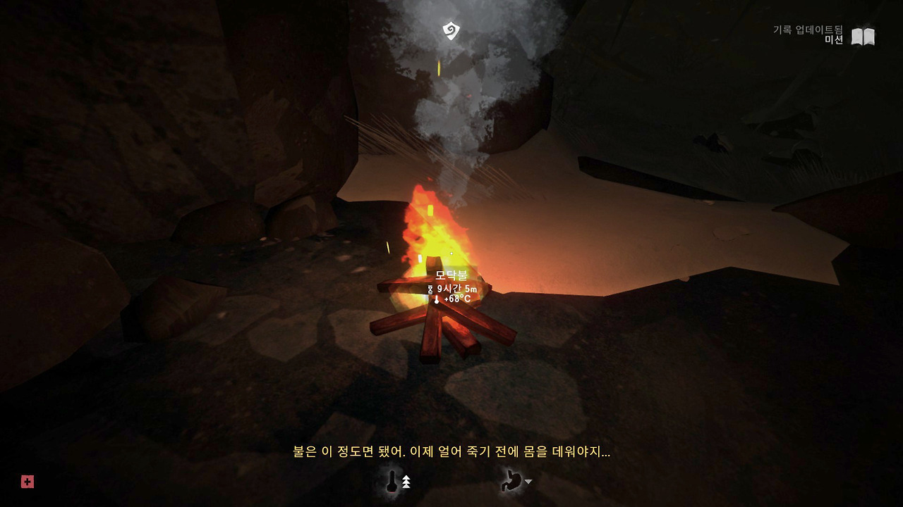 이 게임은 한없이 불편하다. 최소한의 정보조차 제공해주지 않는다. 내가 지금 어디에 있는지 화면상의 맵 같은 것도 없고 시간조차 알 수 없다. 땔감을 구하러 나무를 조각내거나 사냥한 동물을 해체하다 보면 시간은 훌쩍 지나버린다. 산속의 밤은 일단 장막이 한 번 내려오기 시작하면 걷잡을 수 없이 순식간에 어두워져 침낭과 장비를 두고 온 동굴 입구가 어디였는지 찾을 수가 없다. 동굴 입구가 문제가 아니라 당장 발밑조차 보이지 않아 길로 이어지는지 낭떠러지로 향하는지도 알 수 없다.