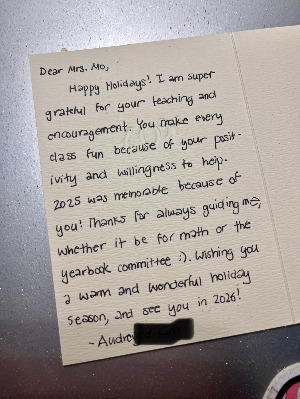 바로 내가 Co-teacher로 들어가는 7학년 Advanced Math 수업의 한 학생이 준 카드이다. 평소 조용하지만, 늘 묵묵히 제 자리에서 최선을 다하던 아이의 정성스레 써 내려간 글귀들이 더 큰 울림으로 다가 온다.