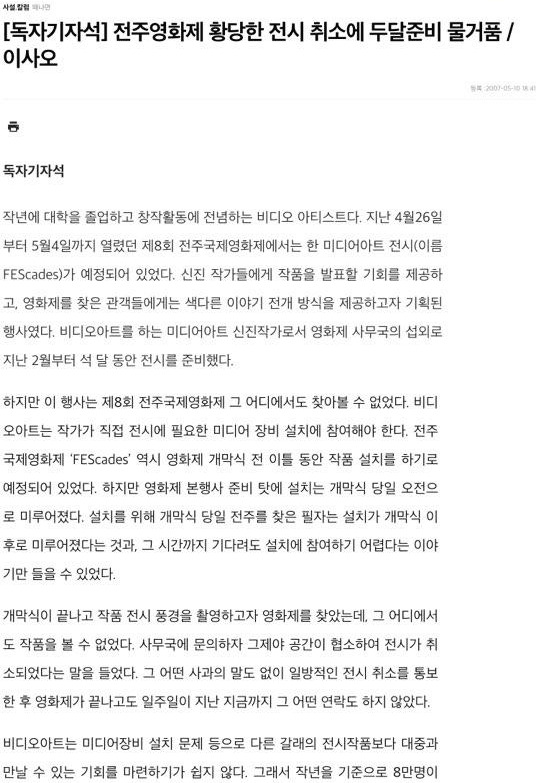 ‘한겨레신문’에 제보한 이유는 2007년 한 국제영화제에서 미디어아트 작품 제작 의뢰를 받았고 작품을 완성했으나, 개막식 당일 전시가 취소되었을 때 한겨레 ‘독자기자석’으로 작가로서 내 입장을 주장하며, 사과 요청한 경험이 있었기 때문이다. 당시 한겨레는 그 국제영화제를 후원하는 언론사였는데, 내 입장을 알고 독자기자석이라는 신문 기고 방식을 안내해주었다. 작품이 전시되지는 못했지만, 영화제 측으로부터 사과받을 수 있도록 했다. 갓 대학을 졸업한 24살 젊은 작가인 나에게 위안이 되었고, 살면서 정정당당하게 내 권리를 주장하고 상대방과 합의점 찾는 데 있어 좋은 경험이 되어 주었다.
