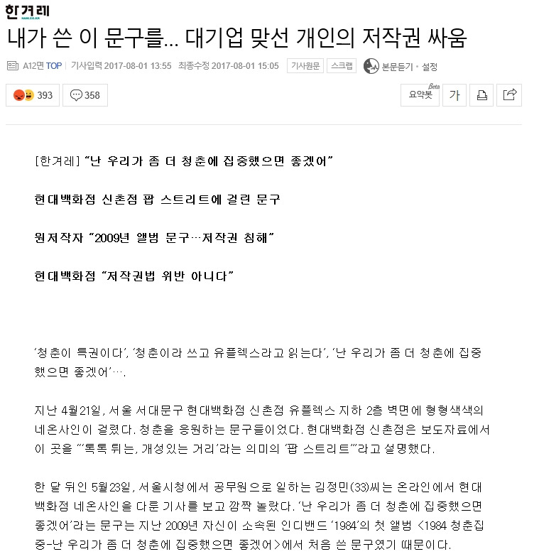 언론에 보도되자 포털 메인에 기사(http://naver.me/xwvygMuP)가 노출되었고, 신문사 SNS 채널에도 다양한 의견이 오갔다. ‘저 문장이 저작물이면 내 일기장에는 저작물이 한가득하다. 싸이월드를 찾아보면 누구나 저런 문장 한 줄 정도 써 둔 것 잊지 않냐?’는 의견부터 ‘그러게 출처를 밝혔어야지 왜 함부로 가져다 쓰냐? 대기업 자기네 회사 이름 함부로 쓰면 손해배상 청구할 거면서 저작물 인정은 왜 안 하냐?’는 의견까지 찬반이 팽배했다. 만약 나에게 변호사가 있었다면 댓글 보며 감성에 젖어 속상했겠지만, 이 댓글들은 여론을 파악하기에 필요한 내용이었고 내가 내 입장을 견고하게 만드는데 필요한 어휘들을 발췌할 수도 있는 자료였다.