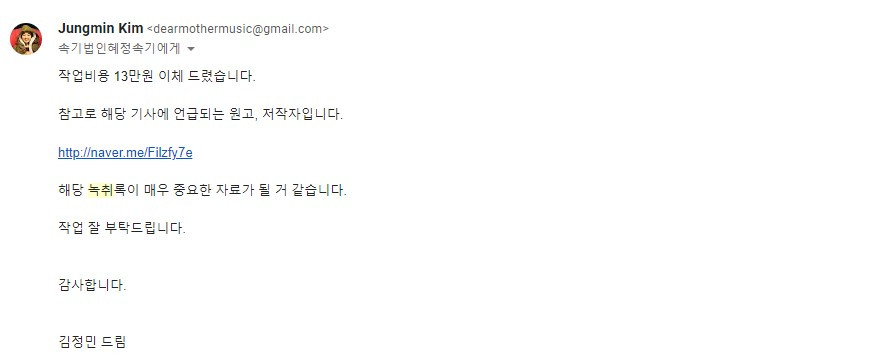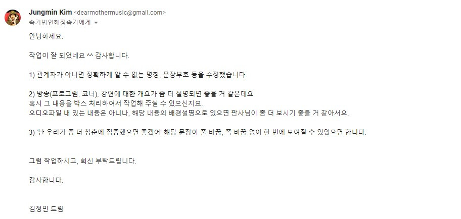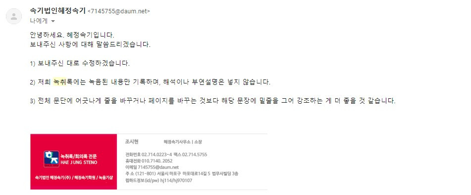 나는 돈을 아끼기 위해 내가 방송 오디오 파일을 직접 ‘녹취’해야지 생각했는데, 재판부에 제출되는 자료는 전문 ‘속기사’를 통해서 번문한 원고만이 입증자료로 쓰일 수 있다. 또 돈이 나가는구나. 가슴 철렁했다. 실은 그전까지 ‘녹취록’을 이렇게 작업해서 제출한다는 것을 전혀 몰랐다. 재판을 진행하면서 지속적으로 돈이 나가던 상황이라 ‘녹취 비용은 또 얼마가 들까?’ 싶었다. 포털 사이트에서 녹취하는 업체 3곳을 검색해 해당 파일을 보내 견적 문의하고, 가장 저렴한 혜정 속기에 의뢰했다. 의뢰하며, 앞서 보도된 한겨레신문 링크를 함께 전달드렸고 이 녹취록이 쓰이는 소송이 어떤 사건인지도 설명했다. 나는 내가 하는 일이 큰 그림에서 어떤 역할을 하는지 알고 임할 때 조금이라도 더 최선을 다했다. 그래서 녹취하시는 분도 ‘일의 맥락’을 이해하신다면 조금 덜 지치고, 좀 더 신경 써 주시지 않을까 싶었다. 몇 번의 수정 작업이 있었는데 가능한 범위 내에서 끝까지 꼼꼼하게 작업해 주셨다.
