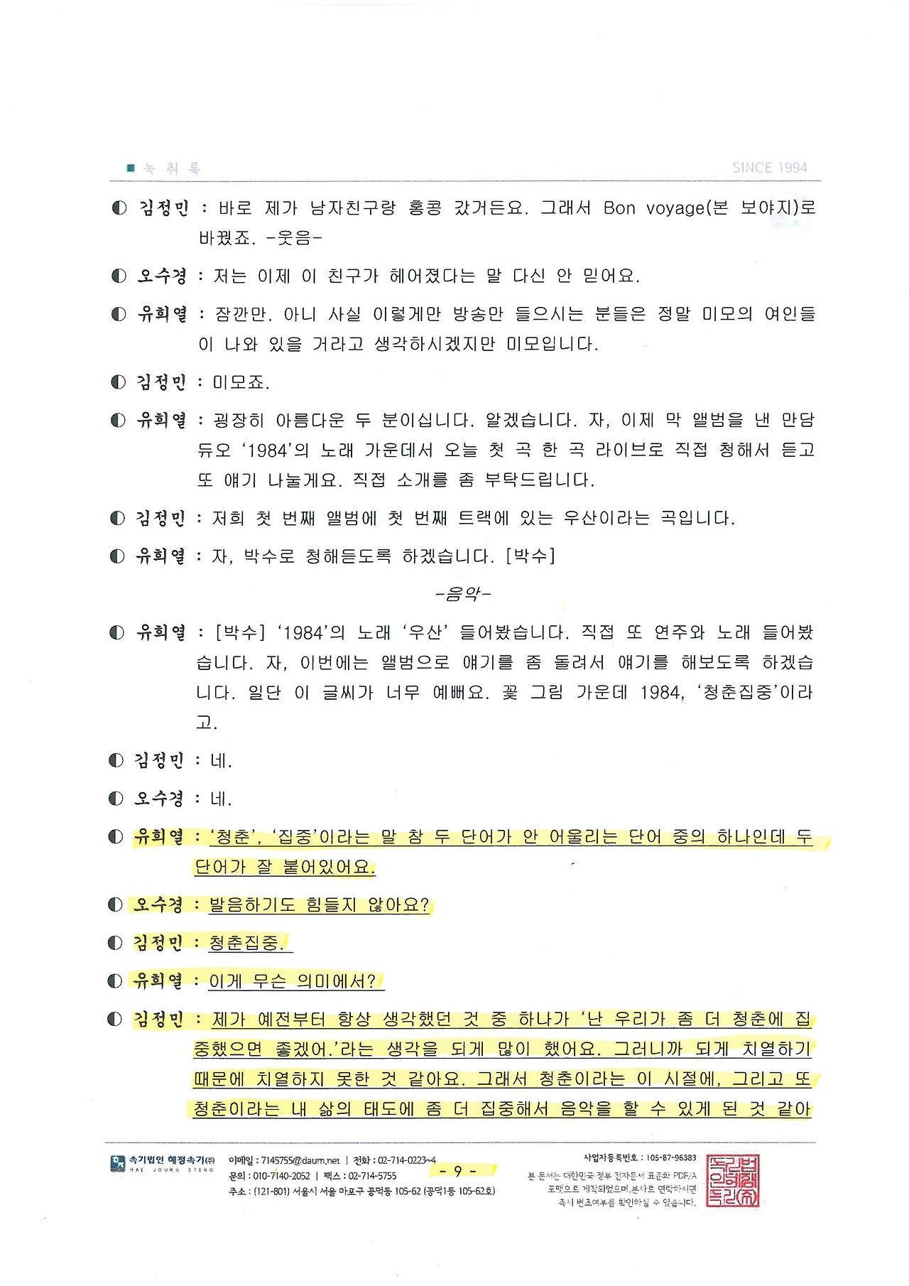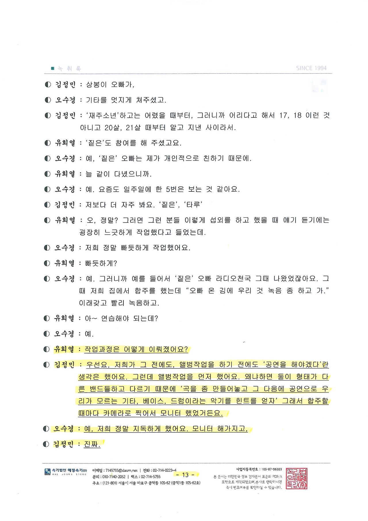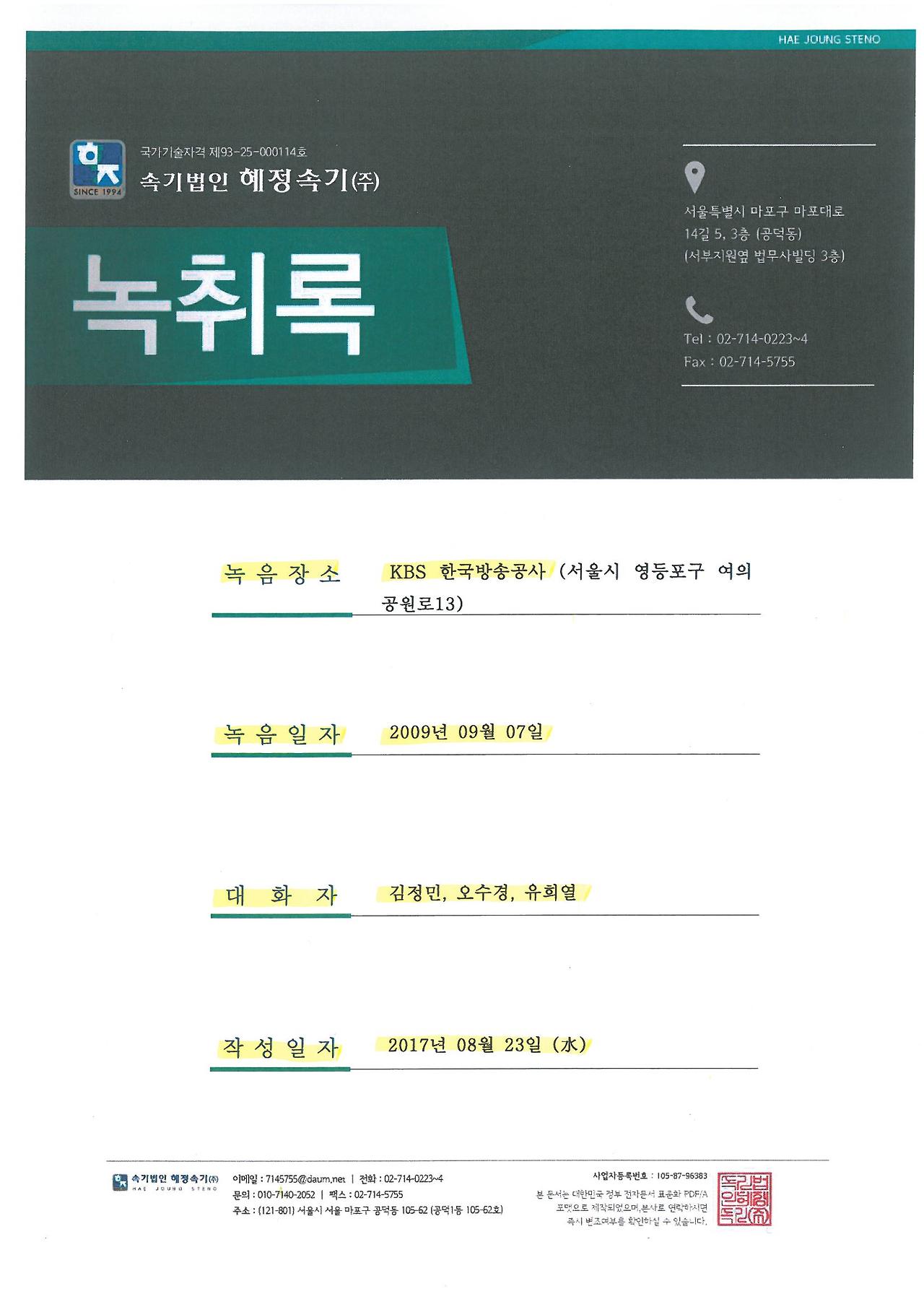 그렇게 나는 2009년 9월 7일 출연한 <유희열의 라디오천국> 일요 야설 무대 녹음 파일과 녹취록을 재판부에 입증자료로 제출하여 저작권자로서 나의 주장을 더욱 견고하게 만들 수 있었다. 제출된 녹취록 중 사건과 직접적으로 관련된 내용 일부를 공개한다.