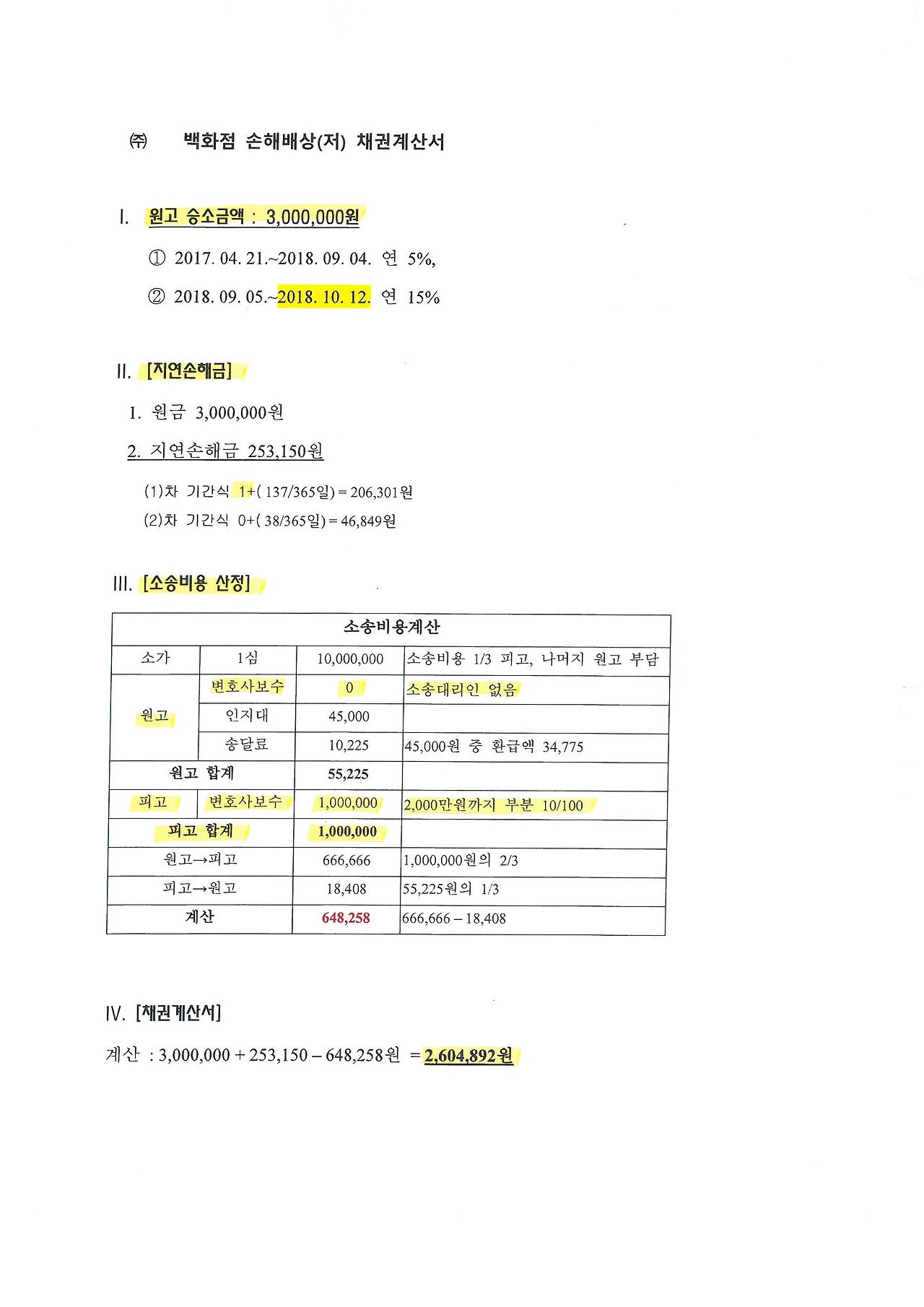 나는 승소했지만 전부승소가 아닌 ‘일부 승소’하여 내가 손해배상액으로 청구한 1,000만 원 중 300만 원을 인정받았다. 1/3 정도의 금액이다. 그래서 나머지 2/3에 해당되는 피고 측의 소송비용을 부담해야 했다. 피고 측이 변호사를 5명이나 선임했어도 그들끼리 맺은 보수 계약에 의한 금액이 아니라, 법원이 정해 놓은 기준에 의해 부담하면 되는 것이다. 즉, 손해배상액인 소가 2,000만 원 이하의 사건이었기 때문에 피고 측이 변호인에게 줘야 하는 1,000만 원 중 10%인 100만 원을 부담하면 되었다. 2018년 10월 12일, 나는 피고인 대기업으로부터 금 2,604,892원을 지급받았다.