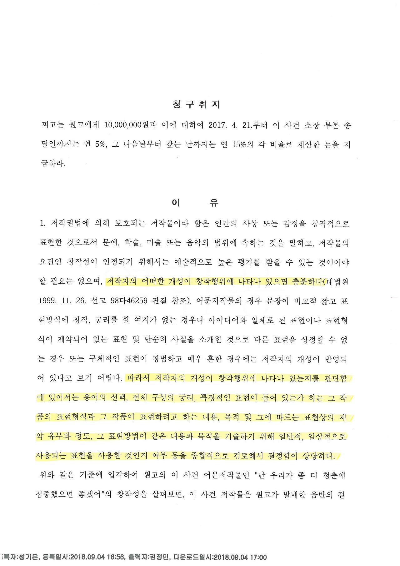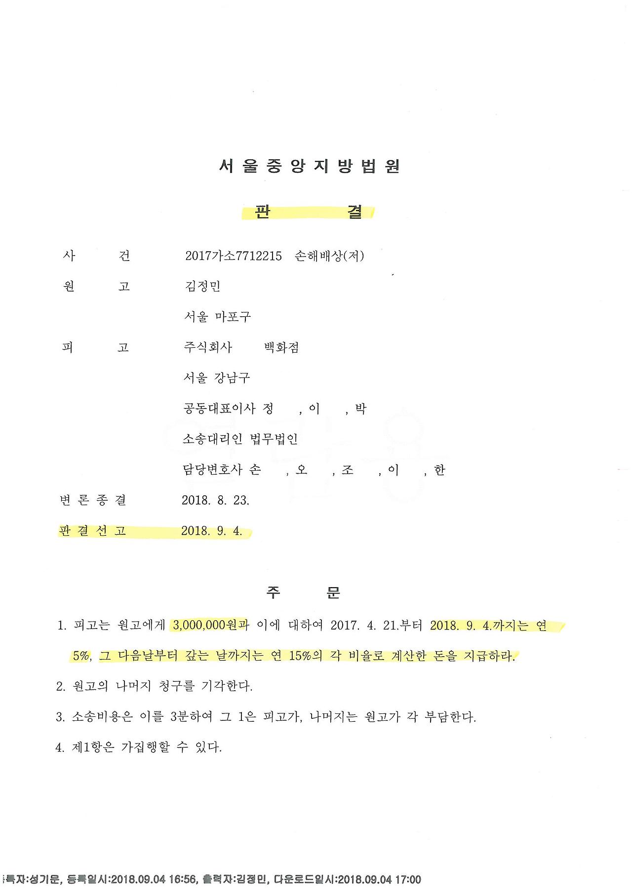 ‘서울중앙지방법원 2017가소7712215 판결정본이(가) 전자발송되었습니다(2018.09.04.)’ 판결문이 올라왔다!