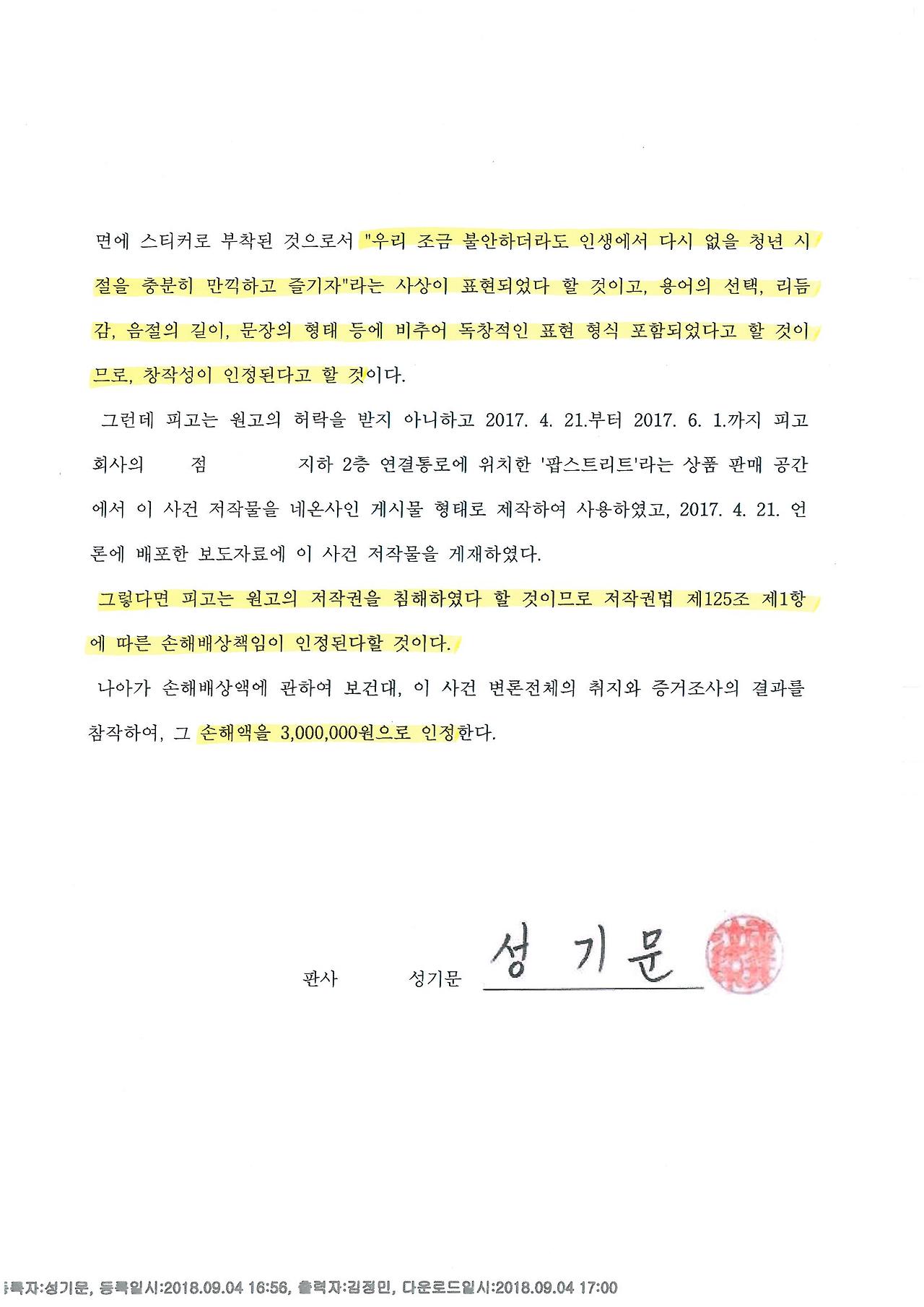 대법원 전자소송 홈페이지에 들어가 로그인했다. 가슴이 두근두근. 판결문은 어떤 내용일까, 분량은 어느 정도일까, 과연 내 주장에 대해 얼마나 재판부가 인정했을지 너무 궁금했다. 세상에. 판결문을 본 나는 입을 다물지 못했다. 내가 원하는 모든 메시지가 판결문에 쓰여있었다. 눈물이 났다. 결국 2018년 9월 4일, 단 한 문장도 저작물이 될 수 있다는 판례를 남겼다. 나의 저작물은 재판부를 통해 창작성을 인정받았고, 대기업은 나의 허락을 받지 않고 저작물을 게재하였기에 저작권 침해를 한 것이므로 손해배상책임이 인정된다는 내용이었다. 피고인 대기업은 나에게 300만 원과 이에 대하여 보도자료 배포 일자인 2017년 4월 21일부터 재판 선고일자인 2018년 9월 4일까지는 연 5%, 그다음 날부터 갚는 날까지는 연 15%의 각 비율로 계산한 돈을 지급하라는 판결이 내려졌다.