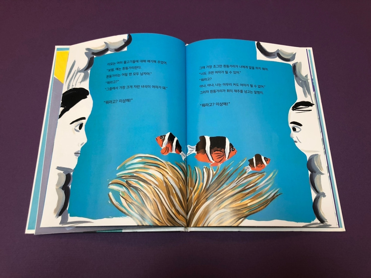 흰동가리는 모두 남자로 태어나 가장 크게 자란 녀석이 여자가 된다. 도화돔 수컷은 일주일 정도 아무것도 먹지 않고 입 속에서 새끼를 키운다. 해마는 암컷의 알을 받아 수컷의 주머니에서 수정시키고 새끼가 자랄 때까지 품는다. 그때마다 아이도 물고기도 서로 “이상해!”를 외친다. 나에겐 당연해 보이는 것이 누군가에게는 다른 세상의 이야기다.