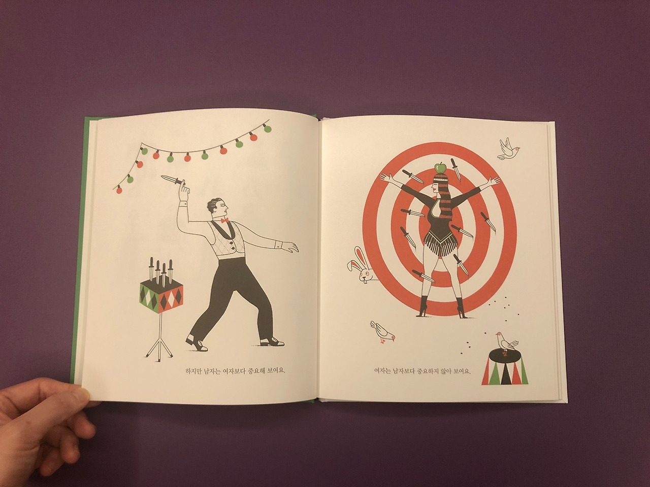 책에서는 일과 지능과 용기는 남자인지 여자인지와는 아무 상관이 없고, 성은 훌륭한 사람이 되거나 그렇지 못한 사람이 되는 것과는 아무 상관이 없다고 얘기한다. 그리고 바로 뒷장에는 "그런데 부모들이 아들은 중요한 사람이 되도록 교육을 시켜요. 반면에 딸은 중요한 남자의 아내가 되도록 가르쳐요"라는 내용이 등장한다.