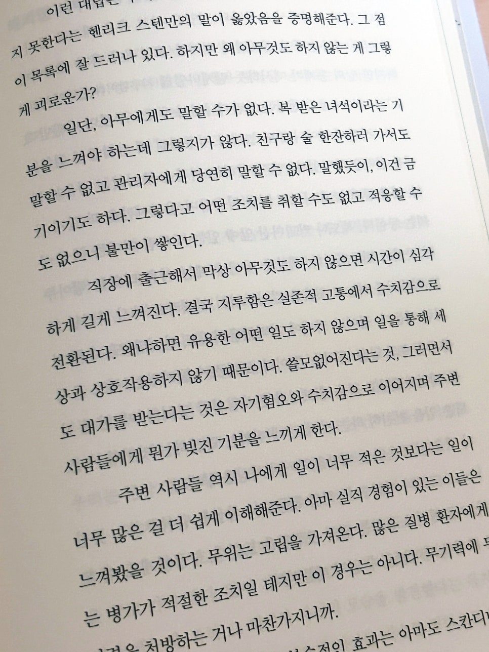『가짜 노동』에서 말하는 가짜 노동은 아무것도 안 하는 게 아니다. 오히려 너무 많이 하는 것이다. 필요 없는 보고서, 굳이 없어도 될 회의, 아무도 끝까지 읽지 않는 자료, 형식만 남은 업무 프로세스. 그리고 “일하고 있다는 티”를 내기 위한 행동들. 이걸 읽으면서 웃음이 나왔다. 웃긴데, 웃기기만 하진 않았다. 너무 익숙해서다. 사실 우리도 안다. 이 일이 진짜 중요한지는, 이 회의가 꼭 필요한지는, 이 메일을 지금 보내야 하는지도. 근데 멈추질 못한다. 멈추면 게으른 사람 될까 봐, 뭔가 안 하고 있으면 불안해서, ‘바쁘다’는 상태가 나를 보호해 주는 것 같아서. 가만히 생각해 보면, 바쁨은 일종의 방패다. “나 지금 너무 바빠”라는 말은 질문을 차단한다. 왜 이 일을 하는지, 이게 정말 필요한지, 다른 방식은 없는지 묻지 않아도 되게 만든다. 이 책은 그걸 개인의 문제가 아니라 문화의 문제라고 말한다. 일을 위한 일이 너무 자연스러워진 사회. 성과보다 ‘존재감’을 증명해야 하는 조직. 뭔가를 계속하고 있어야 안심할 수 있는 분위기 속에서, 가짜 노동은 점점 늘어난다.