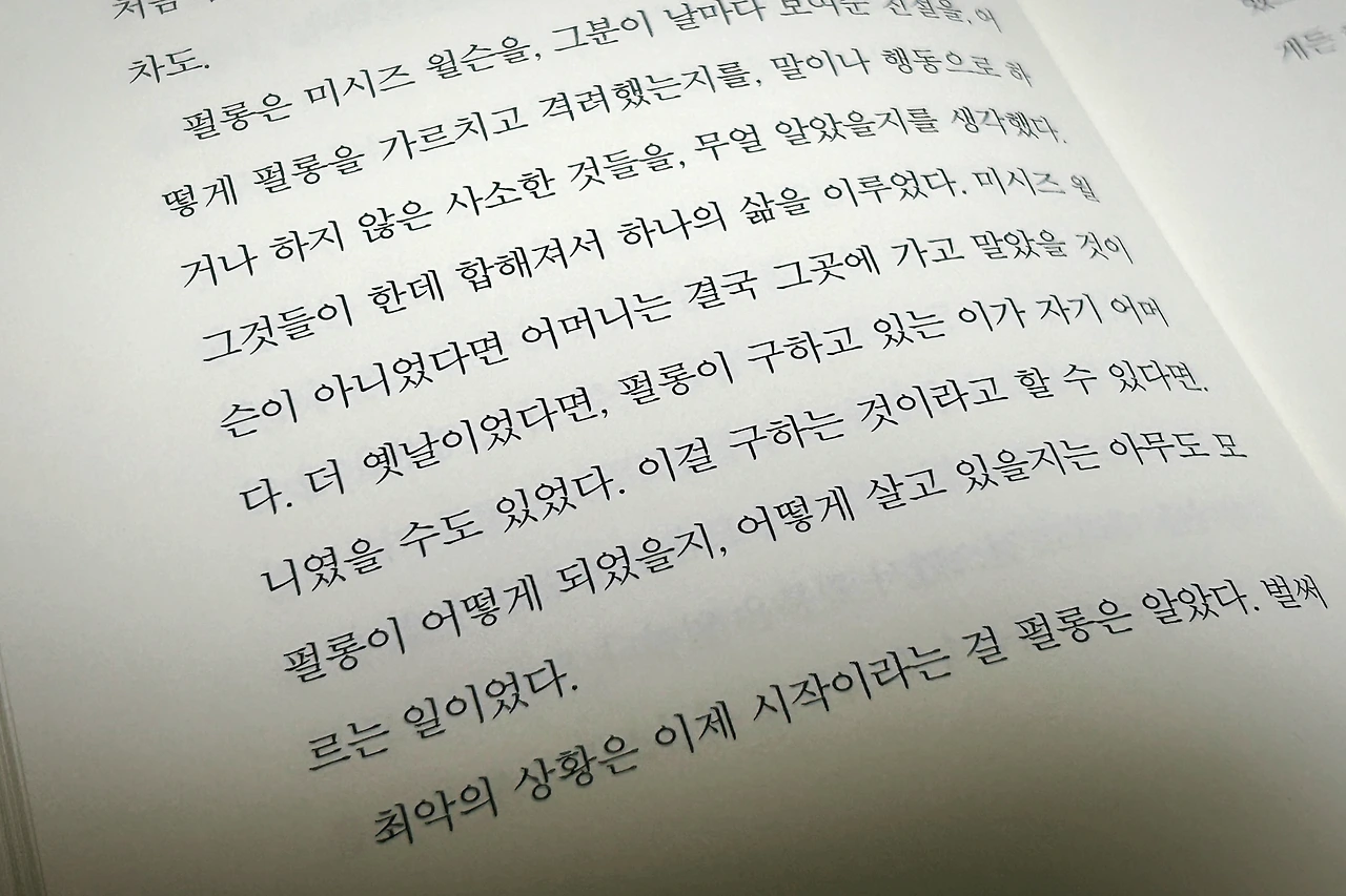 읽으면서 자꾸 마음이 멈췄다. 빌이 보고도 모른 척할 수도 있었던 순간, 그가 선택의 기로에 서 있는 장면들. 그때마다 나는 숨을 고르게 쉬지 못했다. 페이지를 넘기는 속도가 점점 느려졌다. 이 소설이 주는 긴장은 화려하지 않다. 조용하지만 집요하다. 마치 “너라면?” 하고 계속 묻는 느낌이었다. 특히 빌의 과거가 드러나는 부분이 오래 남았다. 그는 누군가의 선의 덕분에 살아남은 사람이었다. 버려질 수도 있었던 아이, 아무도 책임지지 않으려 했던 존재. 그 기억이 현재의 빌을 움직이게 만든다. 누군가는 그저 운이 좋았다고 말할지도 모르지만, 나는 그 장면이 너무 아팠다. 한 인간이 누군가의 선택으로 살아남았다는 사실이 이렇게까지 무겁게 다가올 줄 몰랐다. 그 장면을 읽으며 나는 문득 나 역시 누군가의 배려와 선택 속에서 살아왔을지도 모른다는 생각이 들었다.