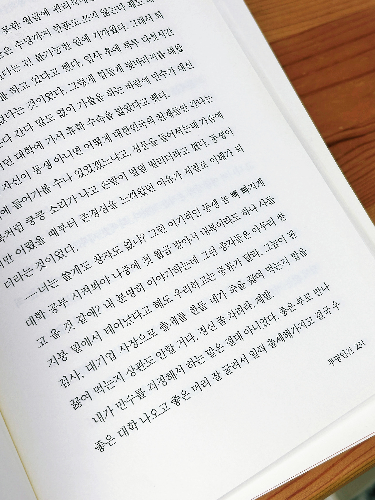 이 소설이 더 잔인한 이유는, 김만수가 끝내 특별해지지 않기 때문이다. 끝내 큰 성공을 하지도 않고, 세상을 바꾸지도 않는다. 마지막까지 ‘그냥 그런 사람’으로 남는다. 우리는 보통 이야기 속 인물이 마지막에는 보상받기를 바란다. 고생했으니까, 착했으니까, 성실했으니까. 하지만 『투명인간』은 그런 위로를 주지 않는다. 현실처럼, 너무 현실처럼 끝난다. 그래서 더 마음에 남는다. 이건 소설인데, 너무 현실 같아서 소설 같지 않다.