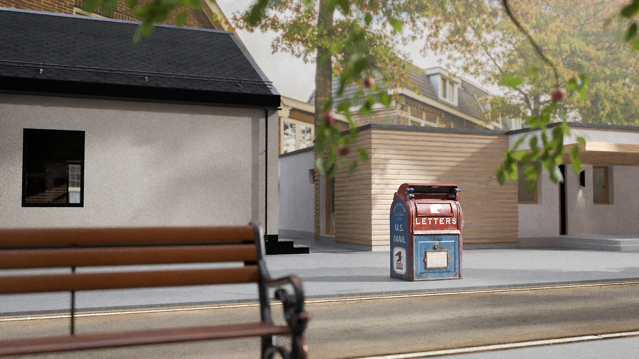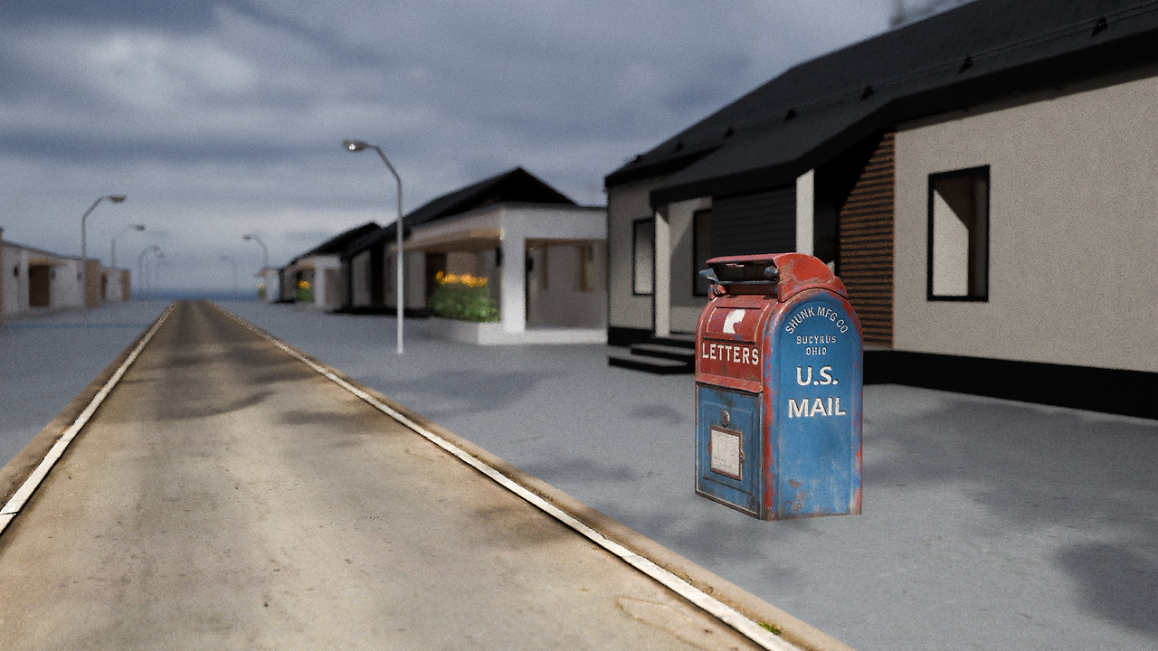 도로 방향으로 공간을 설계할 경우 우체통 뒤로 보이는 모든 요소(가로등, 건물, 간판, 가로수, 인도 등등)를 구성해야 깊이를 가진 구도로 시각화가 가능하다. 심도를 낮춰 우체통 뒤에 초점이 흐려지더라도 자연스러운 배경 흐려짐을 위해서는 최소한의 사물을 배치해야 한다.