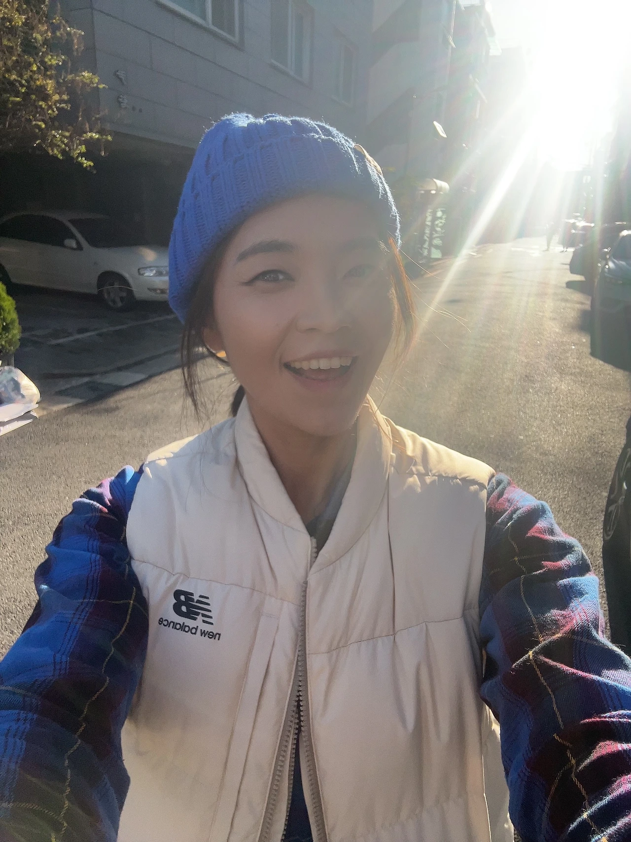 감사하고 기뻐서 머리 뒤로 비치는 빛에 한껏 웃었어요!