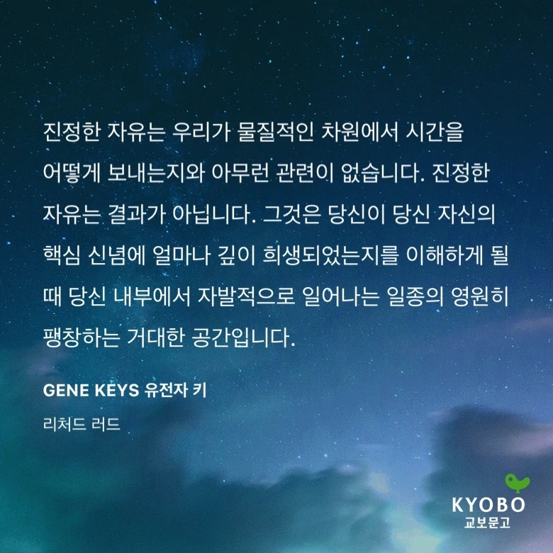 진정한 자유는 우리가 물질적인 차원에서 시간을 어떻게 보내는 지와 아무런 관련이 없습니다. 진정한 자유는 결과가 아닙니다. 그것은 당신이 당신 자신의 핵심 신념에 얼마나 깊이 희생되었는지를 이해하게 될 때 당신 내부에서 자발적으로 일어나는 일종의 영원히 팽창하는 거대한 공간입니다.