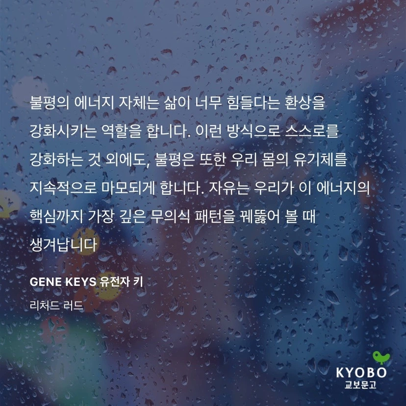 불평의 에너지 자체는 삶이 너무 힘들다는 환상을 강화시키는 역할을 합니다. 이런 방식으로 스스로를 강화하는 것 외에도, 불평은 또한 우리 몸의 유기체를 지속적으로 마모되게 합니다. 자유는 우리가 이 에너지의 핵심까지 가장 깊은 무의식 패턴을 꿰뚫어 볼 때 생겨납니다