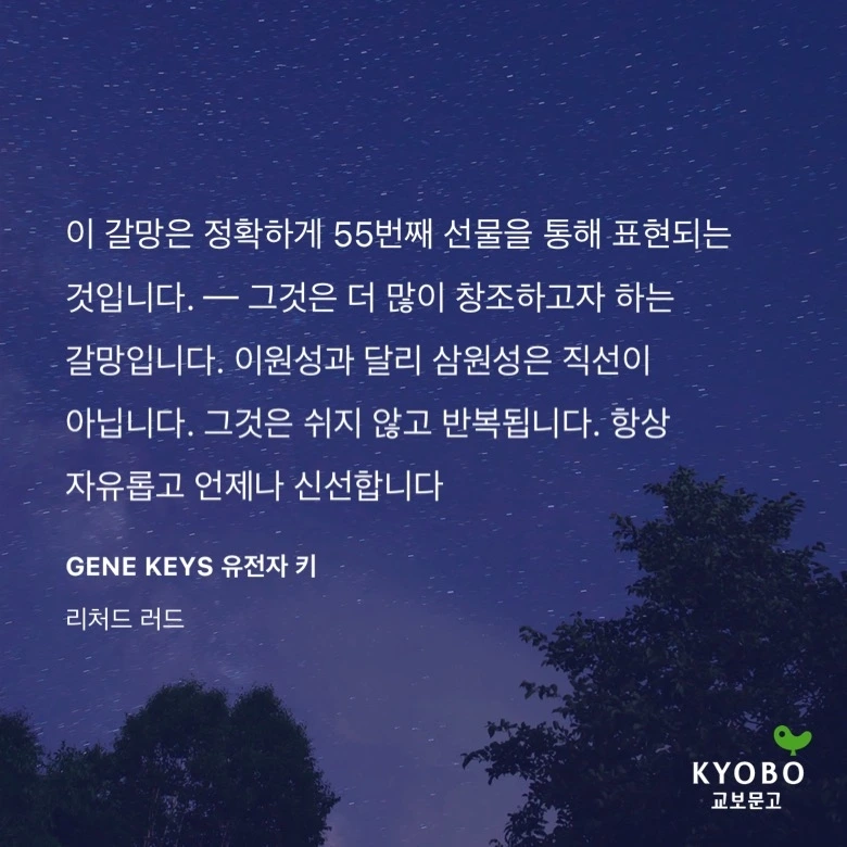 55번 유전자키는 삶의 일의 구를 55.5로 갖고 있는 사람으로서 말하건대, 사랑과 진화의 키다. 내 삶을 돌이켜보면, 언제나 나는 나와 마주하는 누군가를 사랑하고, 때로는 의존하기도 하고, 사랑에 의거해 그를 있는 그대로 수용하려 안간힘을 쓰고, 그를 수용하는 여정에서 나를 희생시키다(55번 그림자, 희생시킴) 끝내 그러한 희생으로 각성되어 자유를 얻는(55번 선물, 시디 자유) 여정의 삶을 살아왔다. 사랑이라고 이름 붙이고 의존해 왔던 관계는 언제나 허상이었다. 누군가를 곁에 붙잡아둘 수도, 곁에 있다고 안심할 수도 없다는 걸, 꽤 오랜 경험으로 알았다. 붙잡거나, 가둬두거나, 통제하는 것 대신, 있는 그대로의 그를 수용하고자 '사랑하고 있는 나'를 들여다보고 또 들여다봤다.